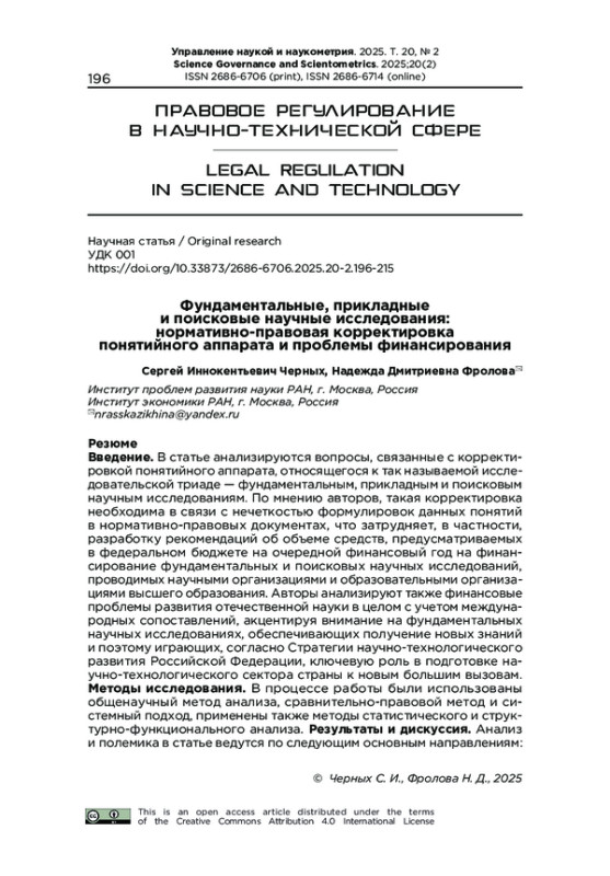 Введение. В статье анализируются вопросы, связанные с корректировкой понятийного аппарата, относящегося к так называемой исследовательской триаде - фундаментальным, прикладным и поисковым научным исследованиям. По мнению авторов, такая корректировка необходима в связи с нечеткостью формулировок данных понятий в нормативно-правовых документах, что затрудняет, в частности, разработку рекомендаций об объеме средств, предусматриваемых в федеральном бюджете на очередной финансовый год на финансирование фундаментальных и поисковых научных исследований, проводимых научными организациями и образовательными организациями высшего образования. Авторы анализируют также финансовые проблемы развития отечественной науки в целом с учетом международных сопоставлений, акцентируя внимание на фундаментальных научных исследованиях, обеспечивающих получение новых знаний и поэтому играющих, согласно Стратегии научно-технологического развития Российской Федерации, ключевую роль в подготовке научно-технологического сектора страны к новым большим вызовам.