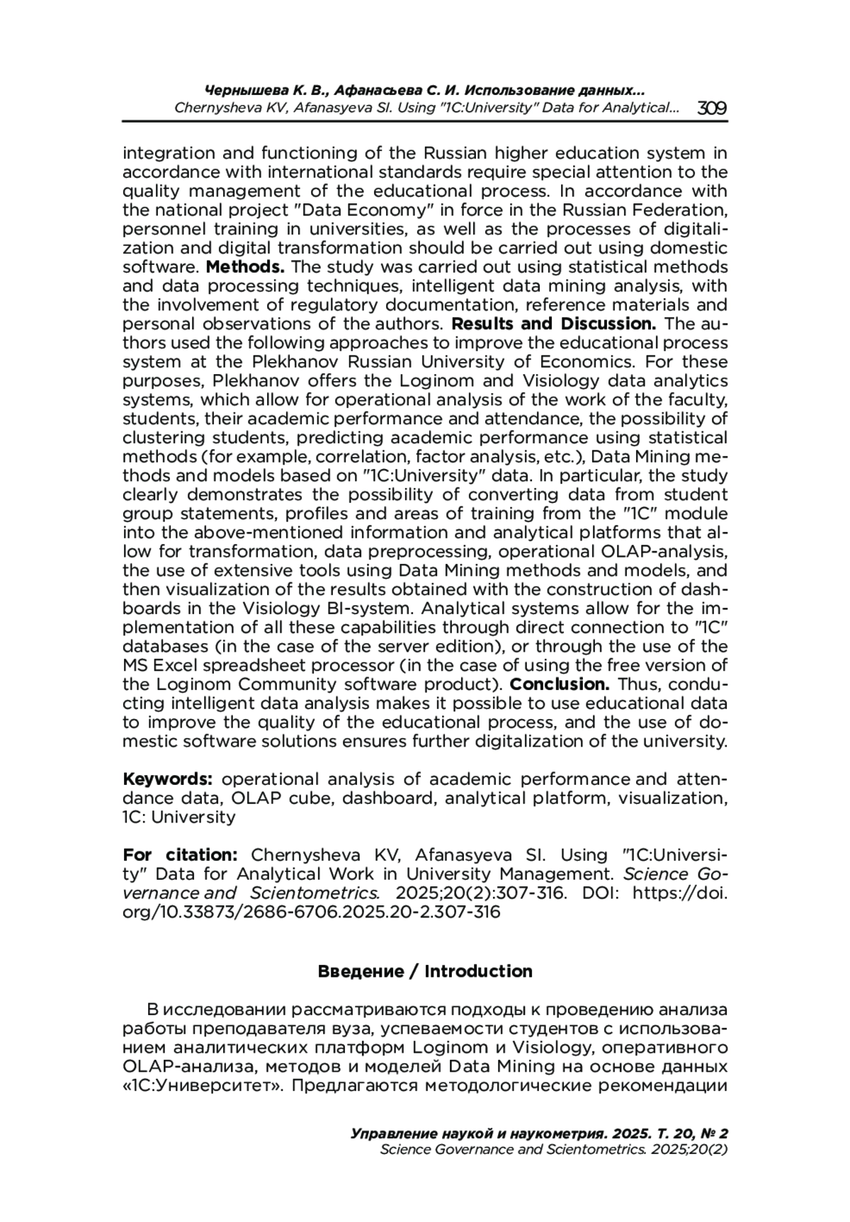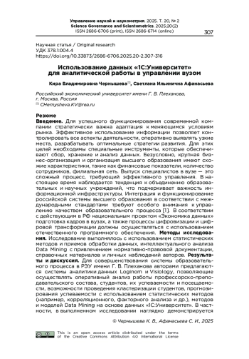 Результаты и дискуссия. Для совершенствования системы образовательного процесса в РЭУ имени Г. В. Плеханова авторами предлагаются системы аналитики данных Loginom и Visiology, позволяющие осуществлять оперативный анализ работы профессорско-преподавательского состава, студентов, их успеваемости и посещаемости, возможности проведения кластеризации студентов, прогнозирования успеваемости с использованием статистических методов (например, корреляционного, факторного анализа и др.), методов и моделей Data Mining на основе данных «1С: Университет». В частности, в выполненном исследовании наглядно демонстрируется возможность преобразования данных ведомостей групп студентов, профилей и направлений подготовки из модуля «1С» в вышеназванные информационно-аналитические платформы, позволяющие осуществлять трансформацию, предобработку данных, проводить оперативный OLAP-анализ, использовать обширный инструментарий c использованием Data Mining методов и моделей, а затем осуществлять визуализацию полученных результатов с построением дашбордов в BI-системе Visiology. Аналитические системы позволяют реализовать все эти возможности посредством подключения напрямую к базам данных «1С» (в случае серверной редакции), либо через использование табличного процессора MS Excel (в случае использования бесплатной версии программного продукта Loginom Community).