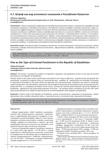 Статья посвящена проблемам законодательной регламентации и применения штрафа как вида уголовного наказания в Республике Казахстан. Исследуются место штрафа в системе наказаний и меры повышения его эффективности; вопросы назначения данного наказания в зависимости от имущественного положения осужденных; проблемы замены штрафа ограничением или лишением свободы в случае его неуплаты осужденным, в том числе при умышленном уклонении от уплаты и невозможности уплаты в силу ухудшения имущественного положения осужденного. Наряду с этим рассмотрено соотношение норм уголовного и уголовного-исполнительного права Республики Казахстан, регламентирующих предоставление отсрочки по уплате штрафа. Анализируется вопрос о соотношении штрафа с другими видами наказания, не связанных с лишением свободы, по уголовному законодательству Республики Казахстан.
