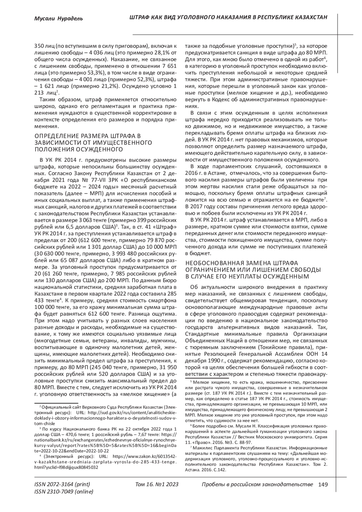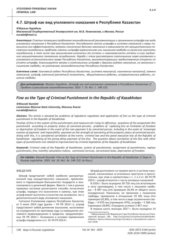 В УК РК 2014 г. предусмотрены высокие размеры штрафа, которые непосильны большинству осужденных. Согласно Закону Республики Казахстан от 2 декабря 2021 года № 77-VII ЗРК «О республиканском бюджете на 2022 – 2024 годы» месячный расчетный показатель (далее – МРП) для исчисления пособий и иных социальных выплат, а также применения штрафных санкций, налогов и других платежей в соответствии с законодательством Республики Казахстан устанавливается в размере 3 063 тенге (примерно 399 российских рублей или 6,5 долларов США)3. Так, в ст. 41 «Штраф» УК РК 2014 г. за преступления устанавливается штраф в пределах от 200 (612 600 тенге, примерно 79 870 российских рублей или 1 301 доллар США) до 10 000 МРП (30 630 000 тенге, примерно, 3 993 480 российских рублей или 65 087 долларов США) либо в кратном размере.
