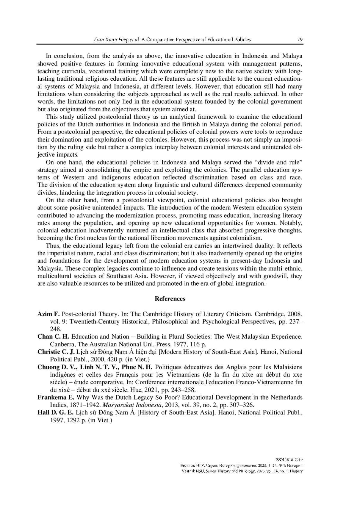 This paper comparatively examines the educational policies of the Netherlands in Indonesia and Britain in Malaya during the 19th – 20th centuries from the perspective of post-colonial theory. By using historical documents and synthesizing existing literature, the study reveals similarities and differences in their approaches. Notably, both implemented a “dual education” system, separating indigenous and Western-oriented education tracks, while adopting secular curricula and centralized administration. The Dutch were more flexible in language policies, whereas the British enforced stricter linguistic segregation. Influenced by the “divide and rule” strategy, segregated school systems for each ethnic group emerged, fostering communal divides. However, these policies inadvertently facilitated modernization, mass education, and female literacy. Moreover, they unintentionally nurtured an intellectual class that catalyzed nationalist movements. While serving colonial interests, the educational reforms laid foundations for modern, diversified education systems in post-colonial Indonesia and Malaysia. The paper contributes insights into colonial legacies and their complex ramifications on Southeast Asian societies development trajectories. It underscores how education served as a double-edged sword, both consolidating colonial rule and sparking movements towards independence and progress.