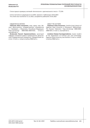 Khudoykina, T. V. Crime prevention imperfectly / T. V. Khudoykina, R. P. Ruzmanova // Bulletin of Science and Practice. - 2022. - Vol. 8. - No. 2. - pp. 245-249. EDN: LHEFFC