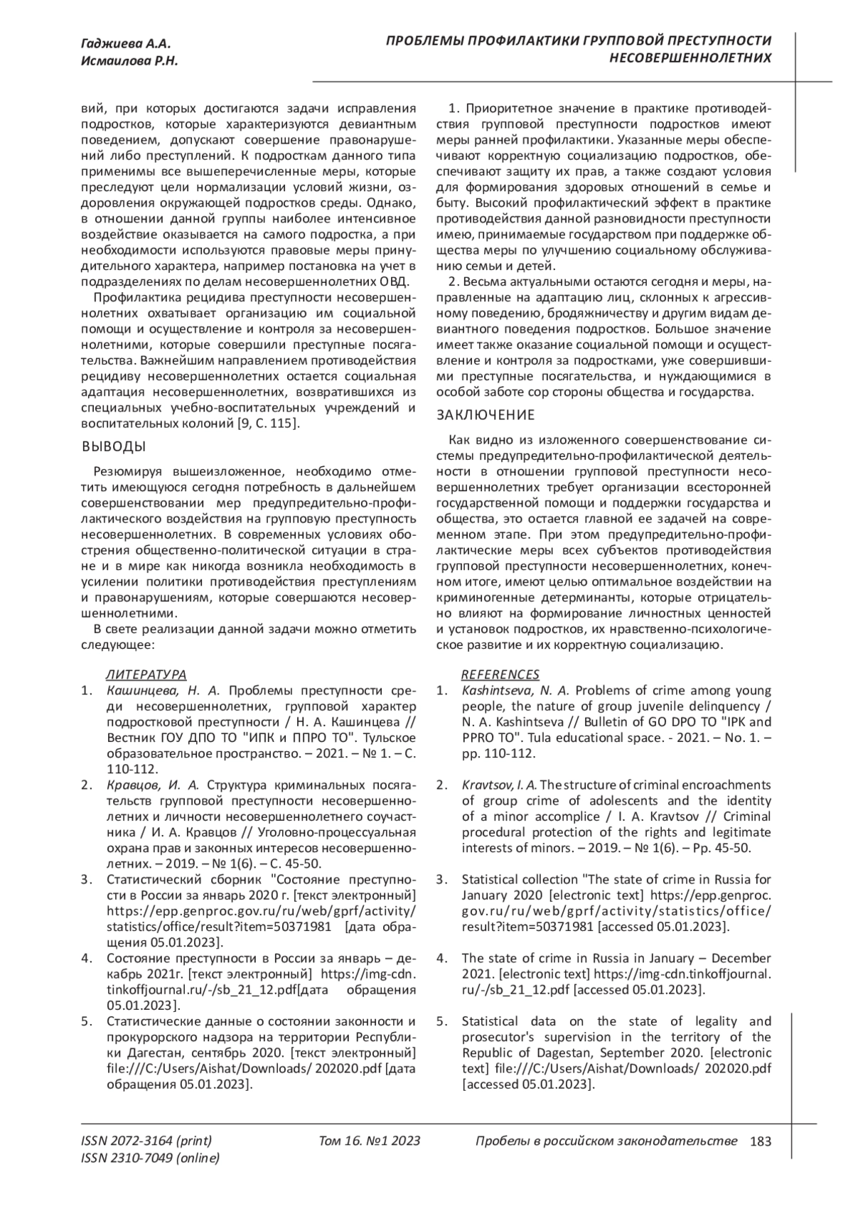 1. Кашинцева, Н. А. Проблемы преступности среди несовершеннолетних, групповой характер подростковой преступности / Н. А. Кашинцева // Вестник ГОУ ДПО ТО “ИПК и ППРО ТО”. Тульское образовательное пространство. - 2021. - № 1. - С. 110-112. EDN: MDLPRP