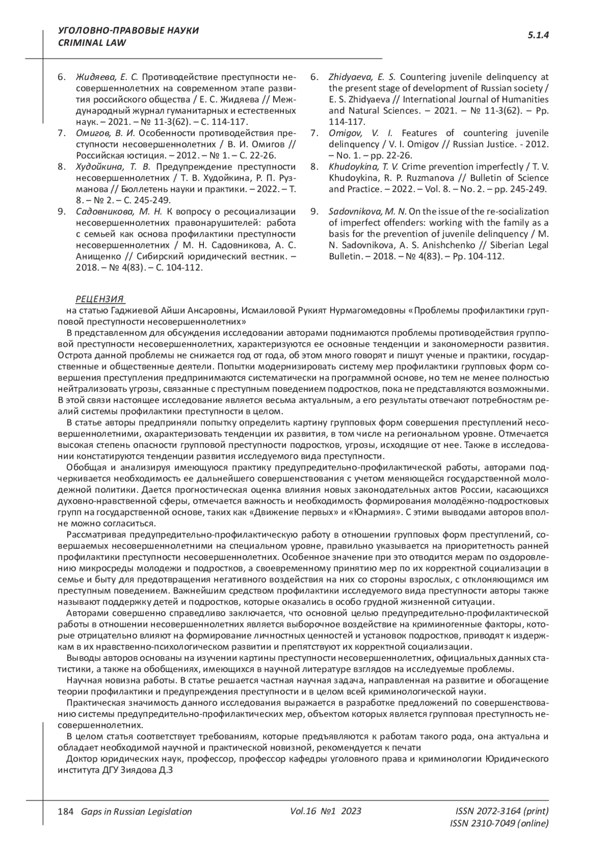 6. Жидяева, Е. С. Противодействие преступности несовершеннолетних на современном этапе развития российского общества / Е. С. Жидяева // Международный журнал гуманитарных и естественных наук. - 2021. - № 11-3(62). - С. 114-117. EDN: AKNZCS