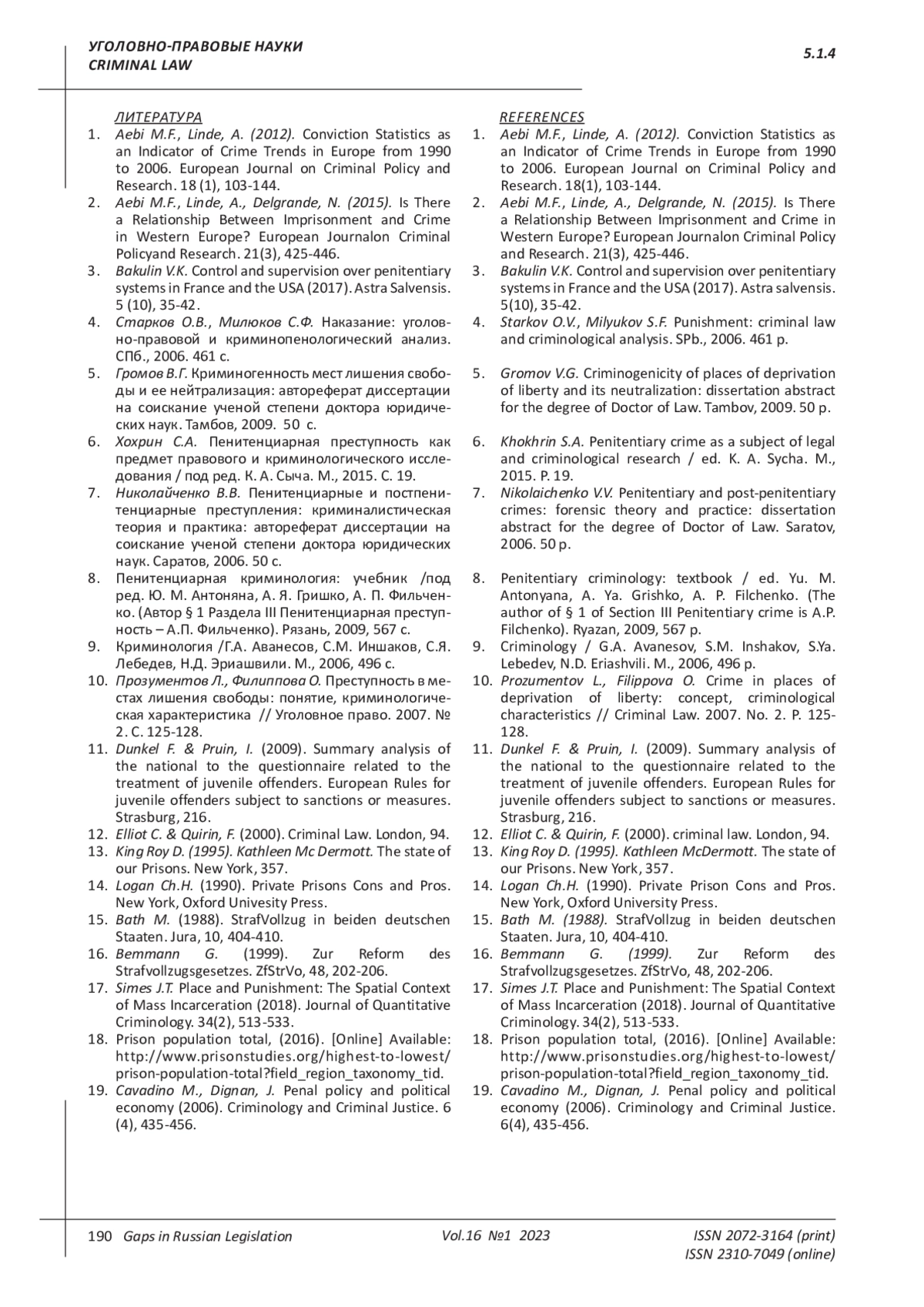 10. Прозументов Л., Филиппова О. Преступность в местах лишения свободы: понятие, криминологическая характеристика // Уголовное право. 2007. № 2. С. 125-128. EDN: KXKSRB