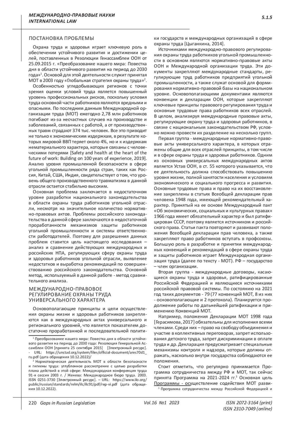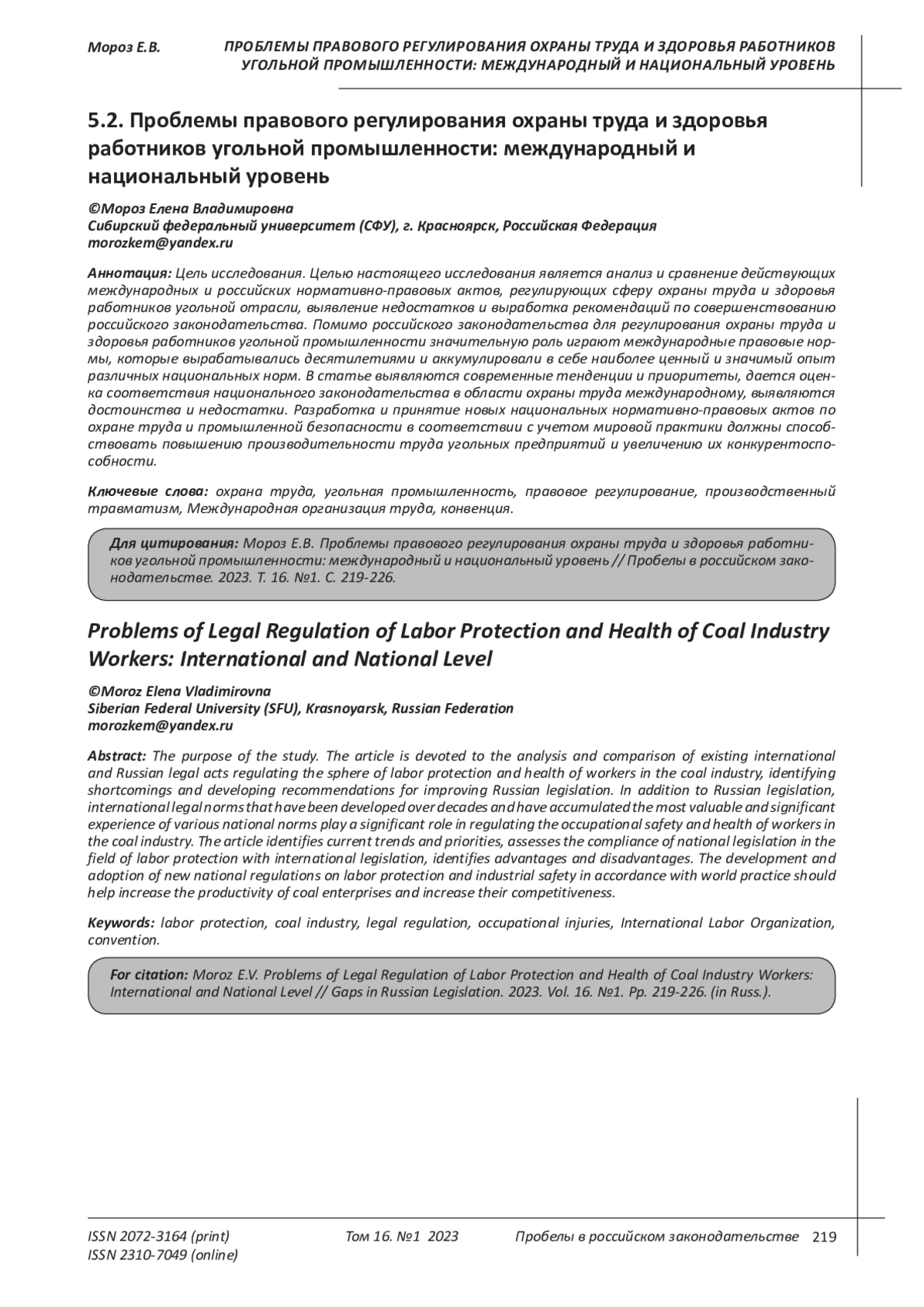Цель исследования. Целью настоящего исследования является анализ и сравнение действующих международных и российских нормативно-правовых актов, регулирующих сферу охраны труда и здоровья работников угольной отрасли, выявление недостатков и выработка рекомендаций по совершенствованию российского законодательства. Помимо российского законодательства для регулирования охраны труда и здоровья работников угольной промышленности значительную роль играют международные правовые нормы, которые вырабатывались десятилетиями и аккумулировали в себе наиболее ценный и значимый опыт различных национальных норм. В статье выявляются современные тенденции и приоритеты, дается оценка соответствия национального законодательства в области охраны труда международному, выявляются достоинства и недостатки. Разработка и принятие новых национальных нормативно-правовых актов по охране труда и промышленной безопасности в соответствии с учетом мировой практики должны способствовать повышению производительности труда угольных предприятий и увеличению их конкурентоспособности.
