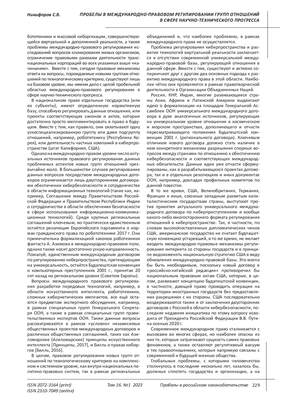 Однако на международно-правом уровне число актуальных источников правового регулирования данных проблемных аспектов новых групп отношений чрезвычайно мало. В большинстве случаев регулирование данных вопросов посредством международных договоров ограничивается лишь двусторонними договорами обеспечении кибербезопасности и сотрудничестве в области информационных технологий (такие как, например, Соглашение между Правительством Российской Федерации и Правительством Республики Индии о сотрудничестве в области обеспечения безопасности в сфере использования информационно-коммуникационных технологий). Среди крупных региональных соглашений ключевым, но практически единственным остаётся резолюция Европейского парламента о нормах гражданского права по робототехнике 2017 г. Она примечательна формализацией законов роботехники фантаста А. Азимова в международно-правовом поле, однако также носит достаточно узкую направленность. Пожалуй, единственным международным договором по регулированию киберпространства, претендующим на универсальность, остаётся Будапештская конвенция о компьютерных преступлениях 2001 г., принятая 20 лет назад на региональном уровне (Советом Европы)