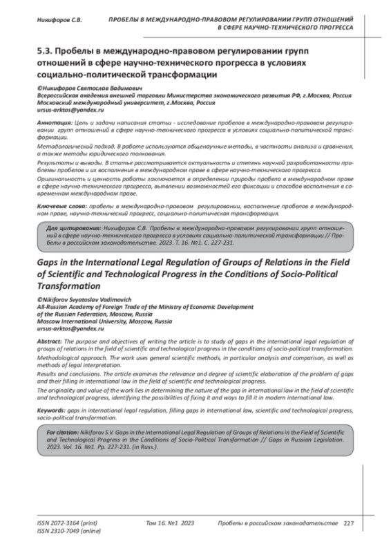 Цель и задачи написания статьи - исследование пробелов в международно-правовом регулировании групп отношений в сфере научно-технического прогресса в условиях социально-политической трансформации. Методологический подход. В работе используются общенаучные методы, в частности анализа и сравнения, а также методы юридического толкования. Результаты и выводы. В статье рассматривается актуальность и степень научной разработанности проблемы пробелов и их восполнения в международном праве в сфере научно-технического прогресса. Оригинальность и ценность работы заключается в определении природы пробела в международном праве в сфере научно-технического прогресса, выявлении возможностей его фиксации и способов восполнения в современном международном праве.