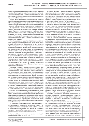 В статье приводится авторский взгляд на учебник “Право интеллектуальной собственности: художественная собственность”, опубликованный в 2019 году в ООО “Научно - издательский центр ИНФРА-М. Проводится краткий анализ рассмотренных в учебном издании тем. Делается вывод о выполнении учебником мотивационной, информационной и систематизирующей функций. В процессе рецензирования был сделан вывод о наличии в учебном пособии необходимого и качественного дидактического материала, корректно подобранных заданий для самоконтроля обучающихся, а также дополнительных элементов справочно-сопроводительного аппарата.