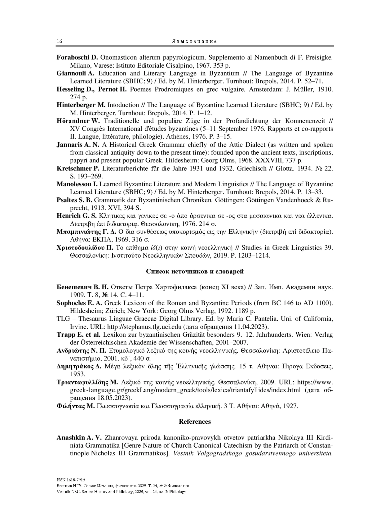 17. Manolessou I. Learned Byzantine Literature and Modern Linguistics // The Language of Byzantine Learned Literature (SBHC; 9) / Ed. by M. Hinterberger. Turnhout: Brepols, 2014. P. 13-33.