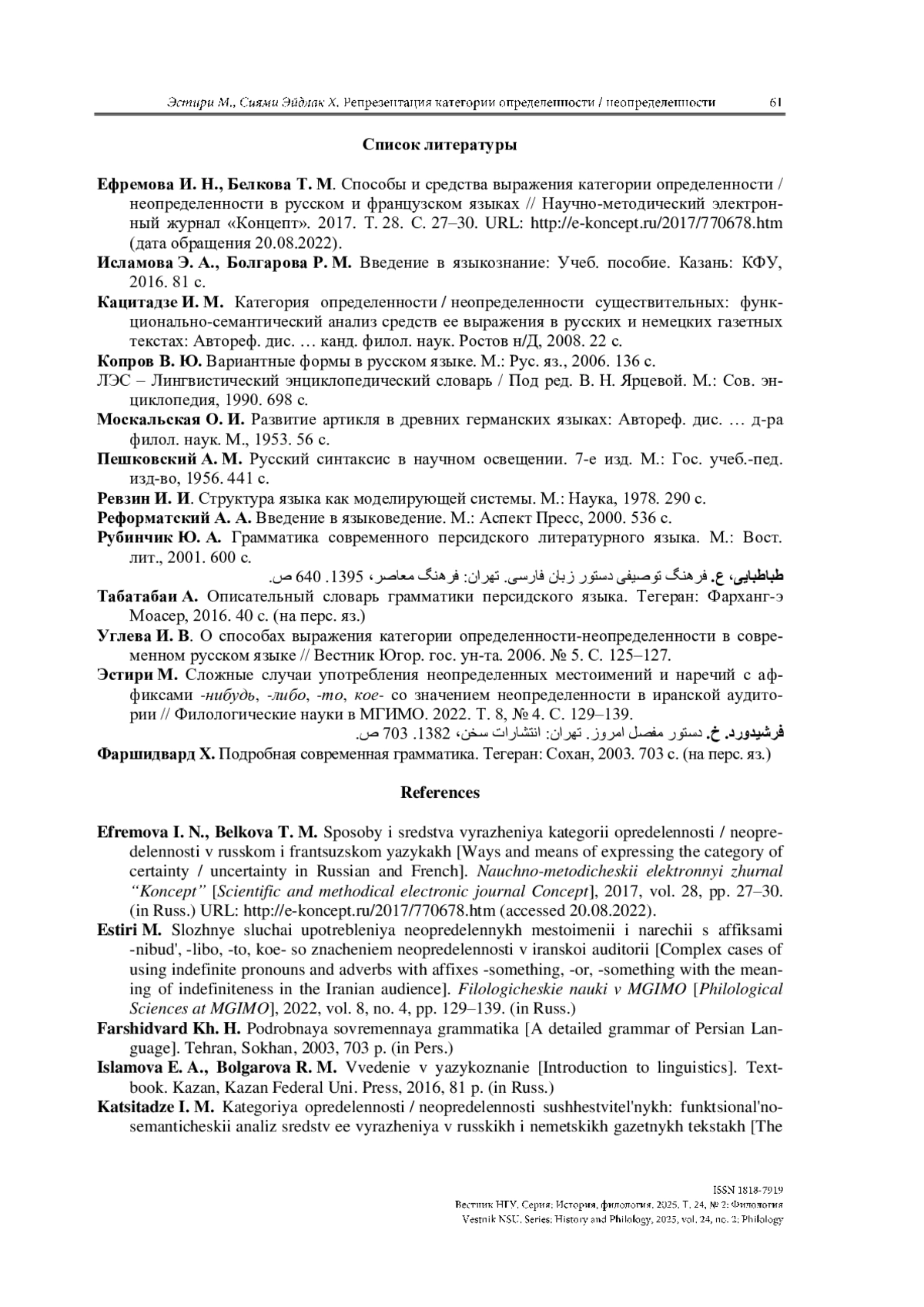 14. Эстири М. Сложные случаи употребления неопределенных местоимений и наречий с аффиксами -нибудь, -либо, -то, кое- со значением неопределенности в иранской аудитории // Филологические науки в МГИМО. 2022. Т. 8, № 4. С. 129‒139.