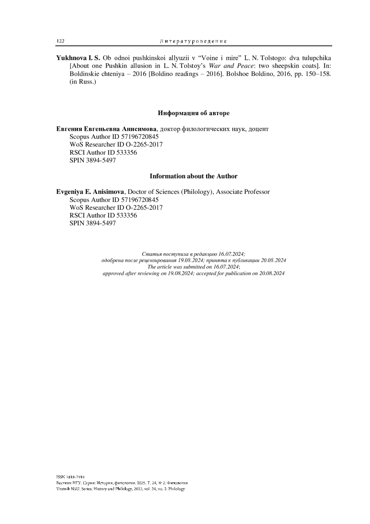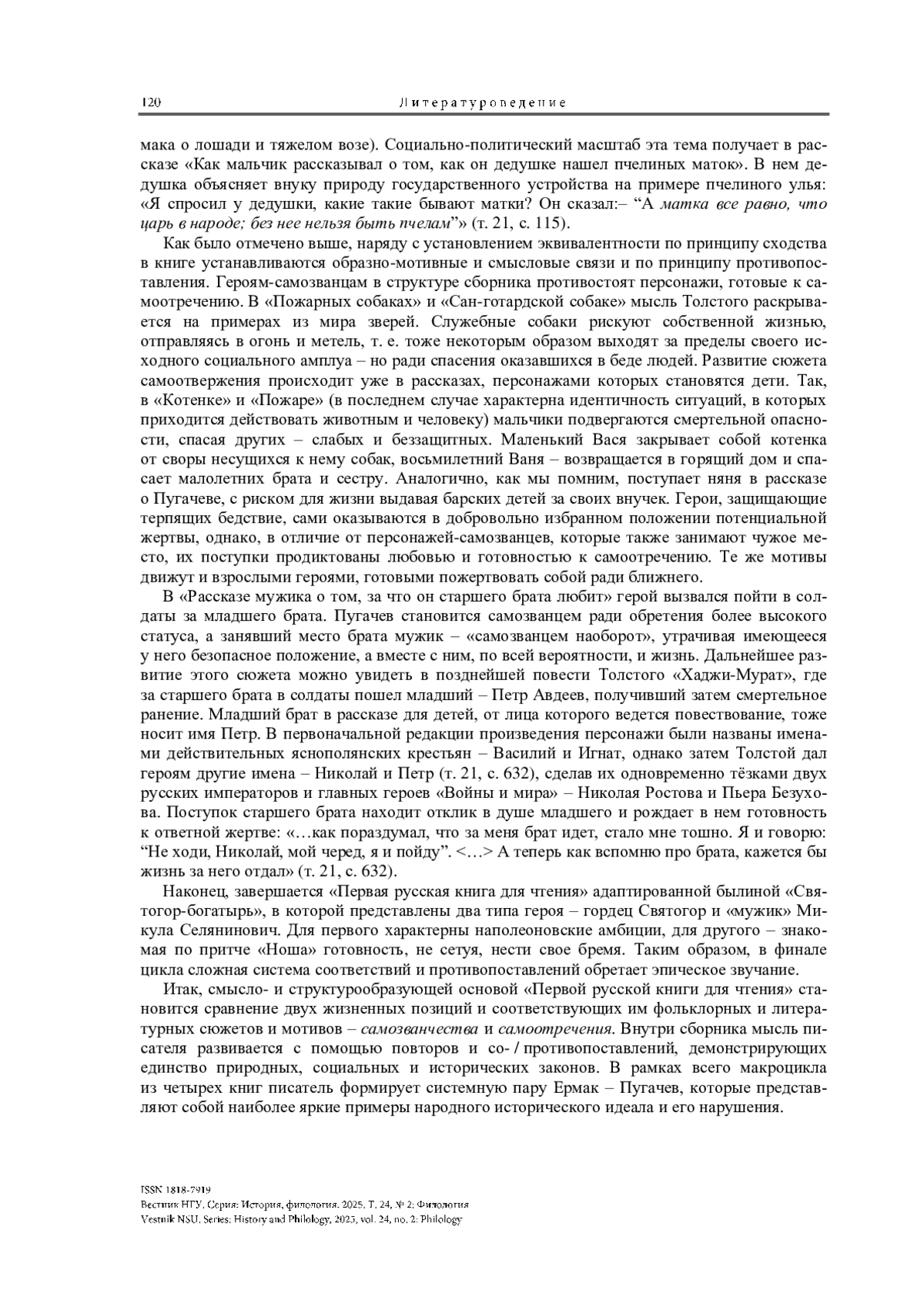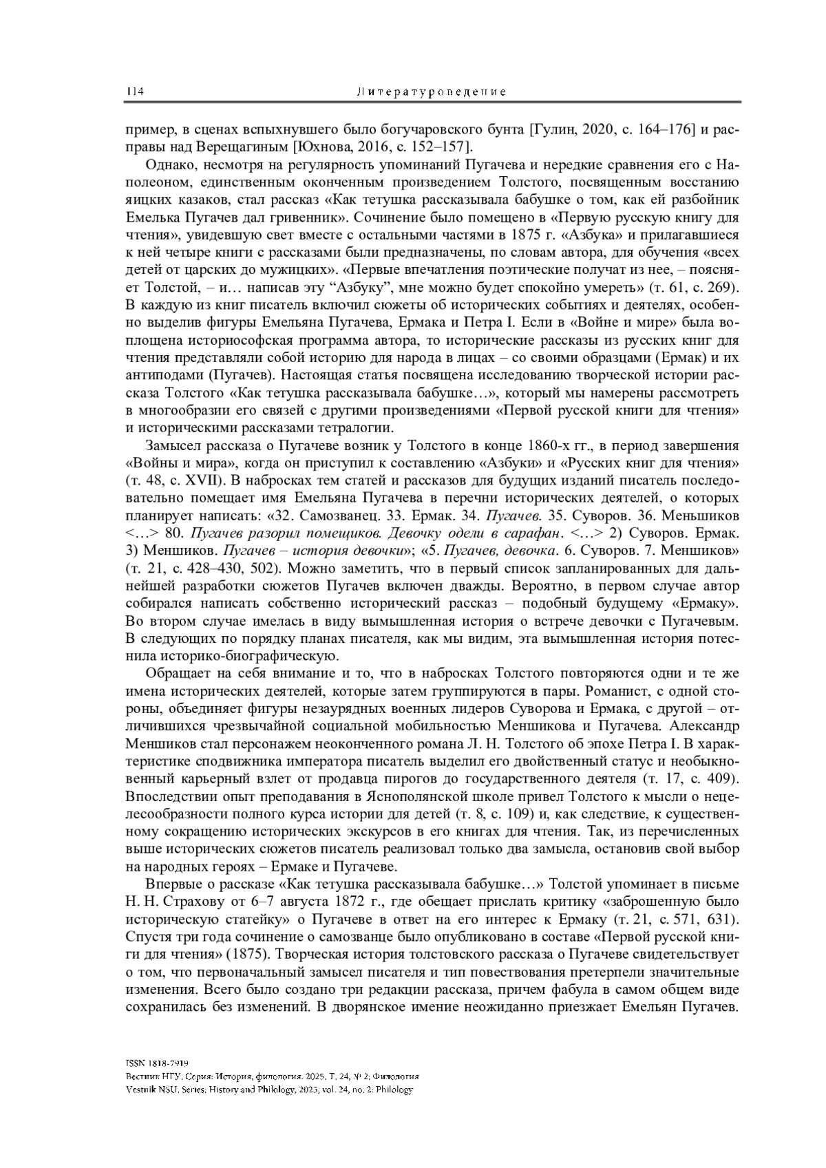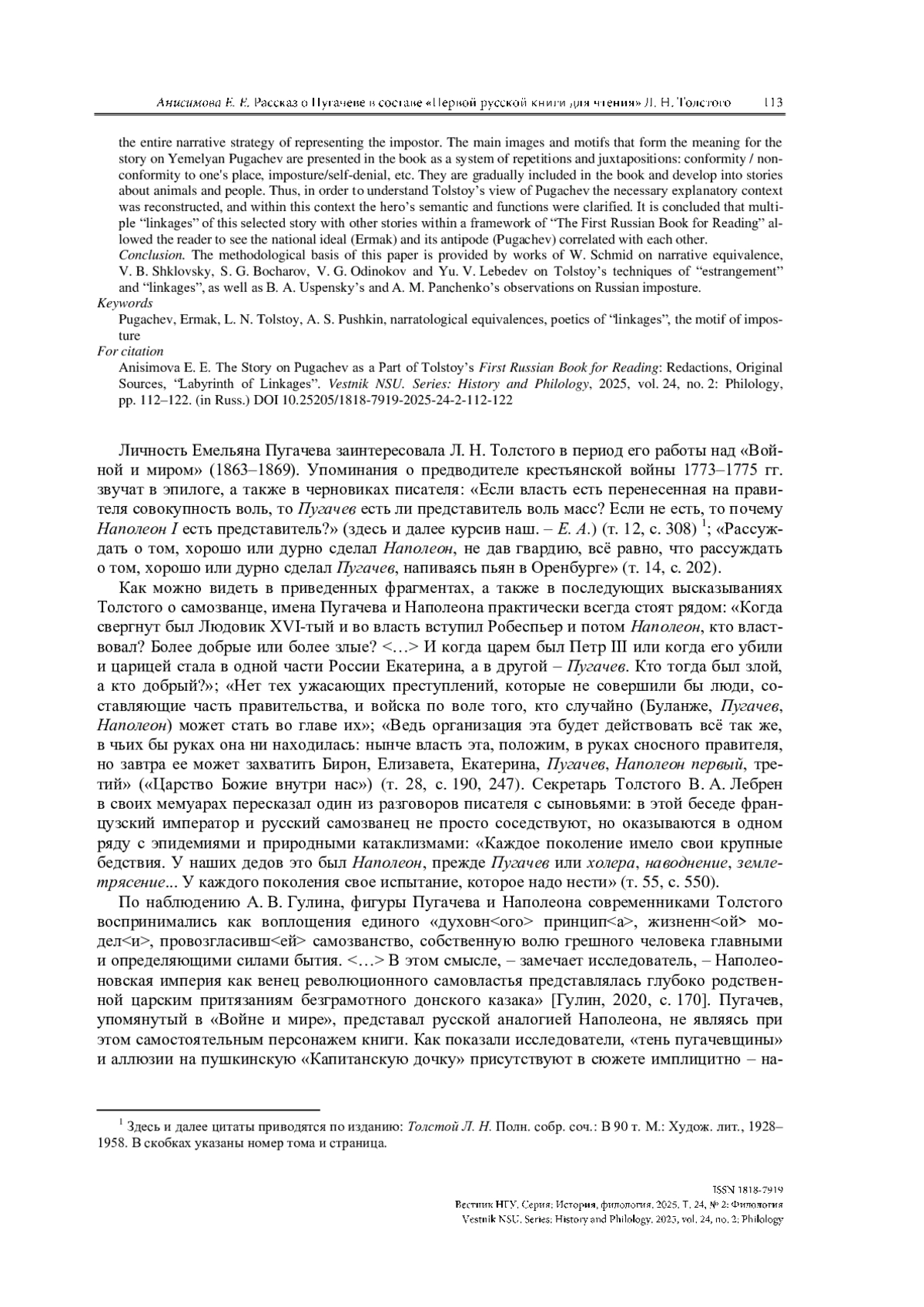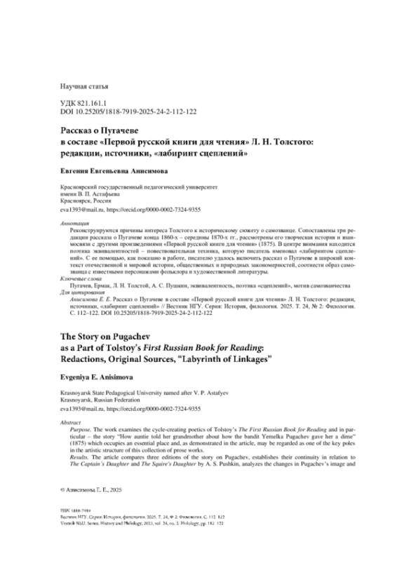 АНИСИМОВА Е. Е. РАССКАЗ О ПУГАЧЕВЕ В СОСТАВЕ «ПЕРВОЙ РУССКОЙ КНИГИ ДЛЯ ЧТЕНИЯ» Л. Н. ТОЛСТОГО: РЕДАКЦИИ, ИСТОЧНИКИ, «ЛАБИРИНТ СЦЕПЛЕНИЙ» // ВЕСТНИК НГУ. СЕРИЯ: ИСТОРИЯ, ФИЛОЛОГИЯ. 2025. ТОМ 24, № 2
