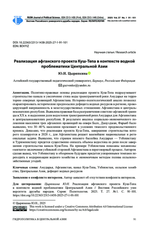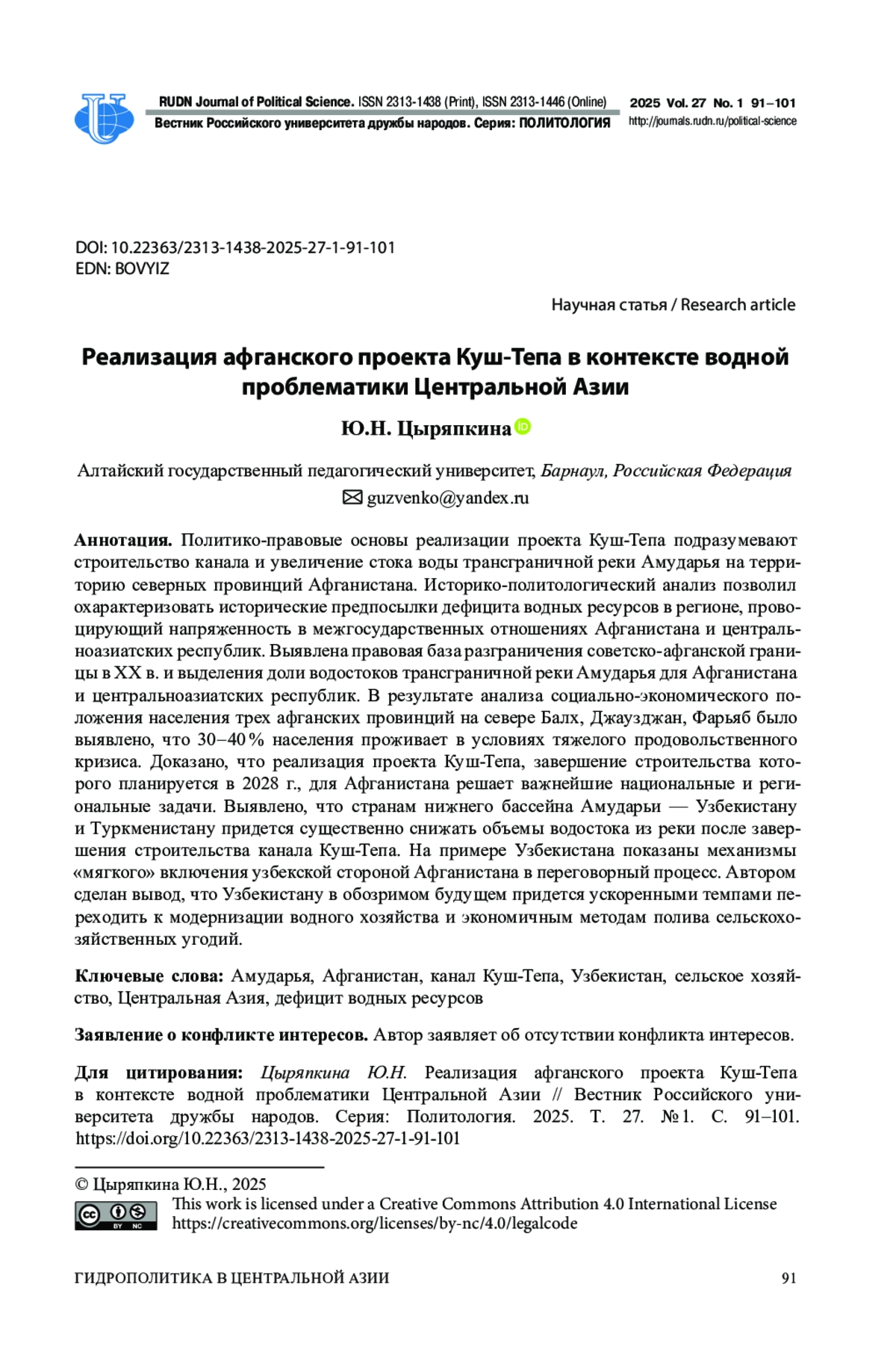 Политико-правовые основы реализации проекта Куш-Тепа подразумевают строительство канала и увеличение стока воды трансграничной реки Амударья на территорию северных провинций Афганистана. Историко-политологический анализ позволил охарактеризовать исторические предпосылки дефицита водных ресурсов в регионе, провоцирующий напряженность в межгосударственных отношениях Афганистана и центральноазиатских республик. Выявлена правовая база разграничения советско-афганской границы в XX в. и выделения доли водостоков трансграничной реки Амударья для Афганистана и центральноазиатских республик. В результате анализа социально-экономического положения населения трех афганских провинций на севере Балх, Джаузджан, Фарьяб было выявлено, что 30-40 % населения проживает в условиях тяжелого продовольственного кризиса. Доказано, что реализация проекта Куш-Тепа, завершение строительства которого планируется в 2028 г., для Афганистана решает важнейшие национальные и региональные задачи. Выявлено, что странам нижнего бассейна Амударьи - Узбекистану и Туркменистану придется существенно снижать объемы водостока из реки после завершения строительства канала Куш-Тепа. На примере Узбекистана показаны механизмы «мягкого» включения узбекской стороной Афганистана в переговорный процесс. Автором сделан вывод, что Узбекистану в обозримом будущем придется ускоренными темпами переходить к модернизации водного хозяйства и экономичным методам полива сельскохозяйственных угодий.