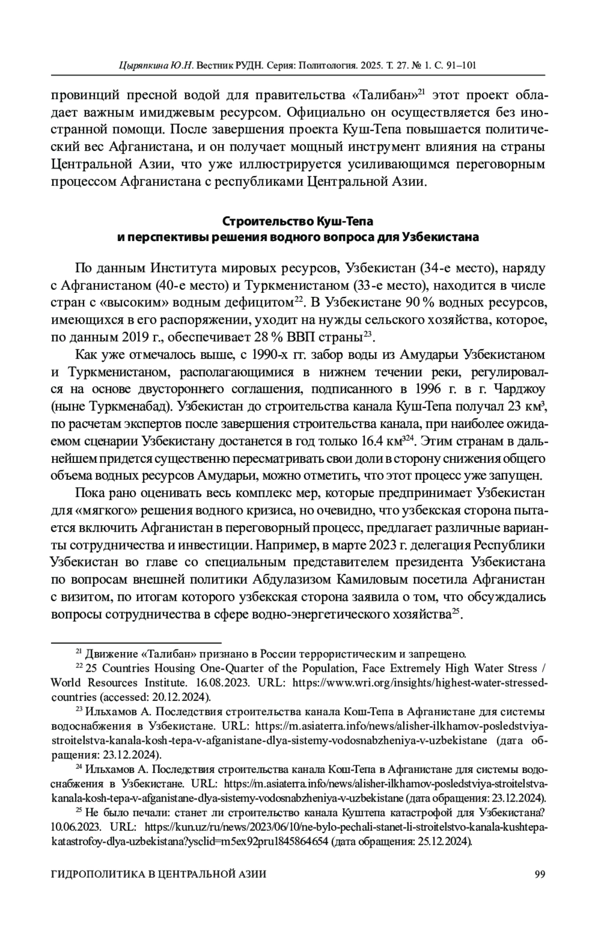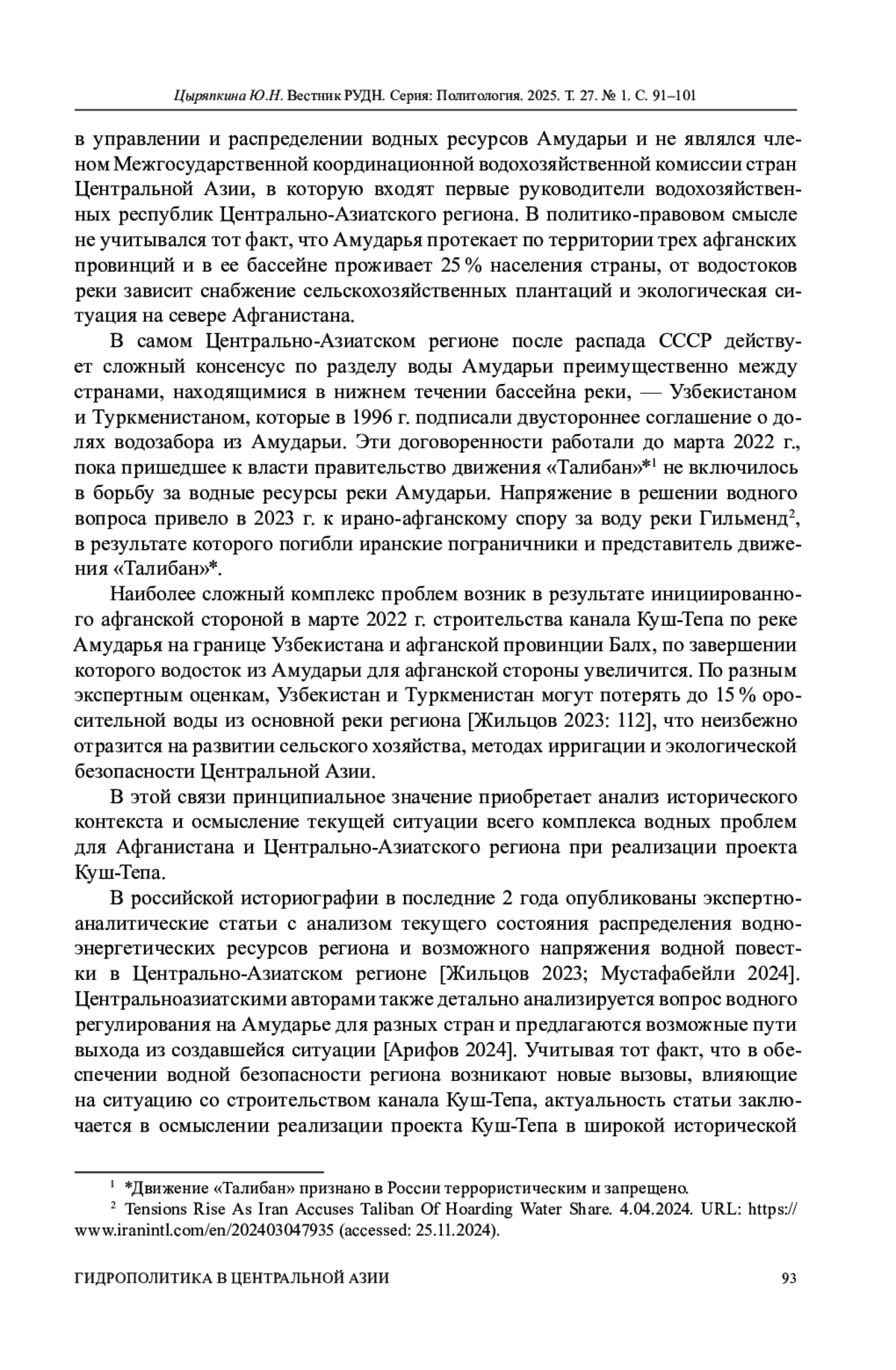 2. Жильцов С.С. Проблема дефицита водных ресурсов в Центральной Азии: фактор Афганистана // Проблемы постсоветского пространства. 2023. Т. 10. № 2. С. 110-119. ;. DOI: 10.24975/2313-8920-2023-10-2-110-119 EDN: OQTYBK