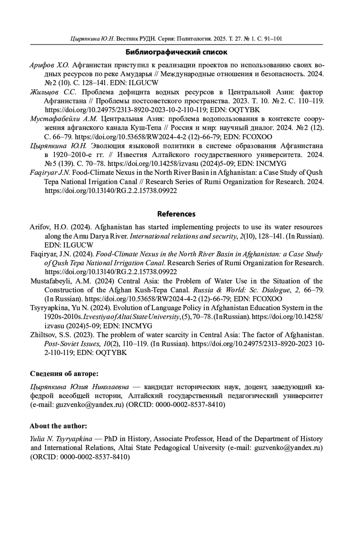4. Цыряпкина Ю.Н. Эволюция языковой политики в системе образования Афганистана в 1920-2010-е гг. // Известия Алтайского государственного университета. 2024. № 5 (139). С. 70-78. 10.14258/izvasu (2024)5-09;. DOI: 10.14258/izvasu(2024)5-09 EDN: INCMYG