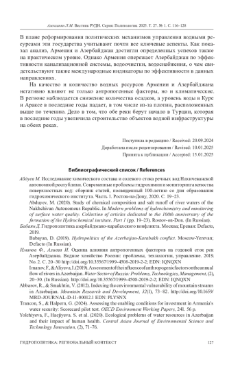 3. Иманов Ф., Алиева И. Оценка влияния антропогенных факторов на годовой сток рек Азербайджана. Водное хозяйство России: проблемы, технологии, управление. 2019. No. 2. С. 20-30 ;. DOI: 10.35567/1999-4508-2019-2-2 EDN: IQNQXN