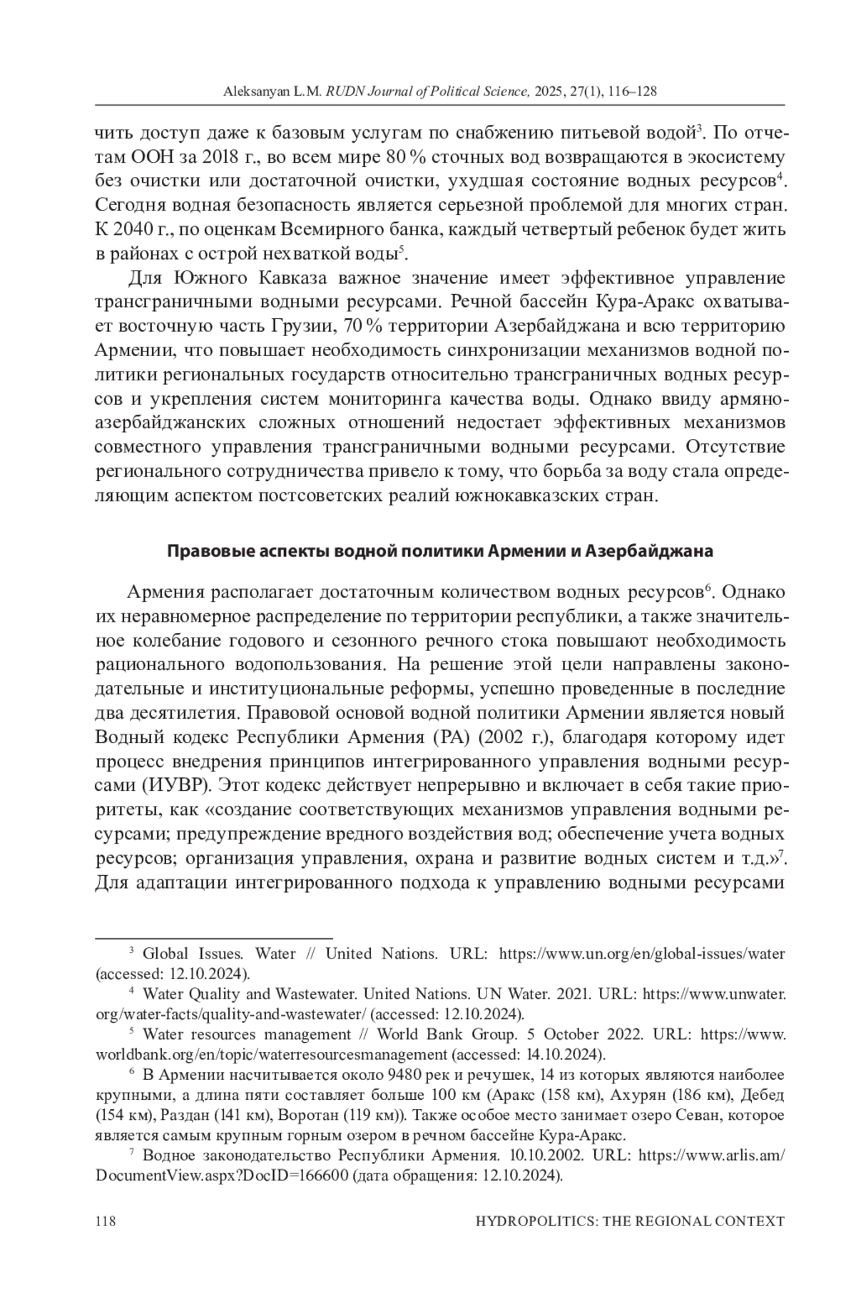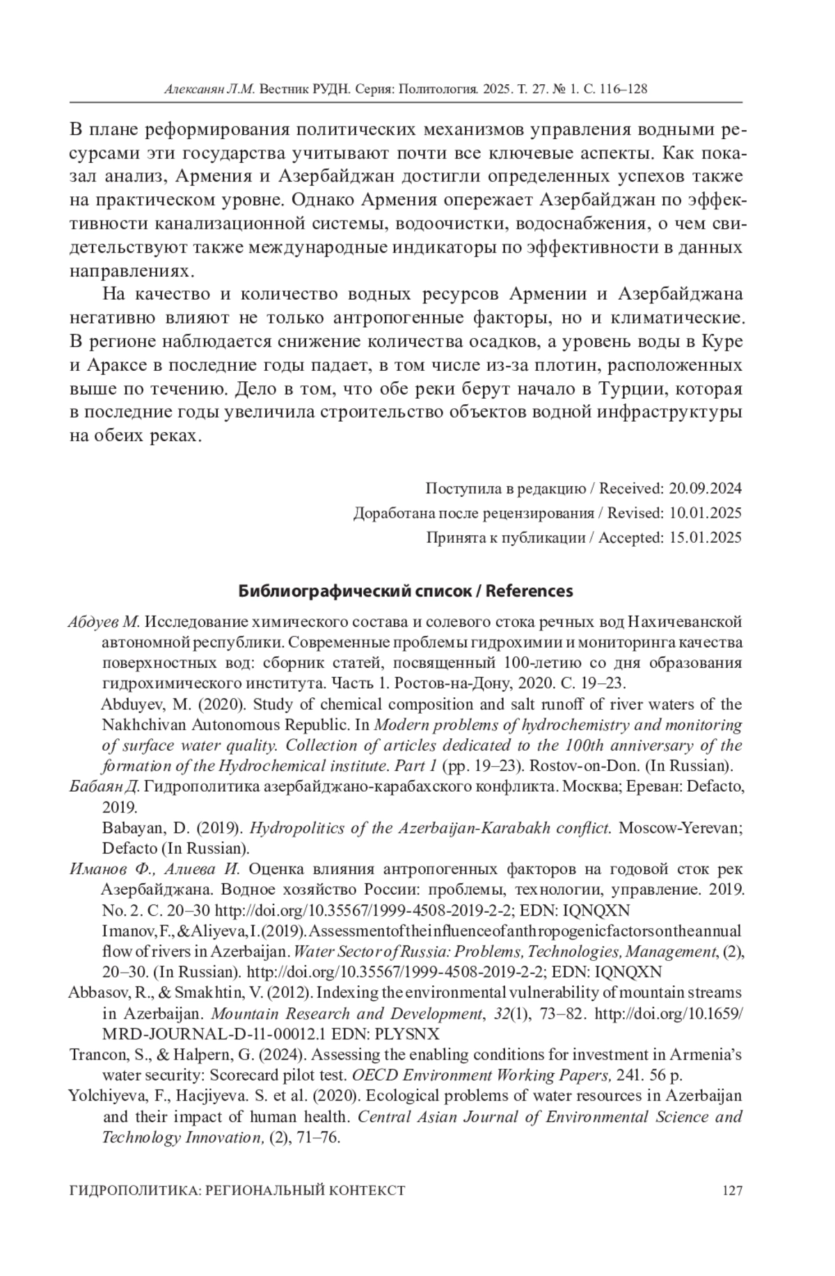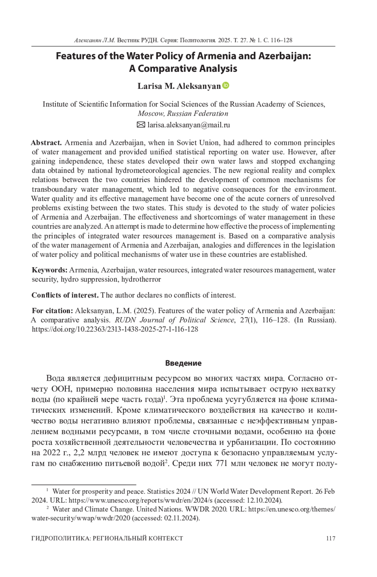 Армения и Азербайджан, находясь в составе Советского Союза, придерживались общих принципов управления водными ресурсами, предоставляли единую статистическую отчетность по использованию воды. Однако после приобретения независимости эти государства разработали собственные законы о воде, а также перестали обмениваться данными, полученными национальными гидрометеорологическими агентствами. Новая региональная реальность и сложные отношения между двумя странами препятствовали разработке общих механизмов по управлению трансграничных водных ресурсов, что привело к негативным последствиям для окружающей среды. Качество воды и ее эффективное управление стали одним из острых уголков неразрешенных проблем, существующих между двумя государствами. Исследование посвящено изучению водной политики Армении и Азербайджана. Проанализированы эффективность, а также недостатки управления водными ресурсами этих стран. Сделана попытка определить, насколько эффективен процесс внедрения принципов интегрированного управления водными ресурсами. На основе сравнительного анализа водного хозяйства Армении и Азербайджана установлены аналогии и отличия в законодательстве водной политики и политических механизмах водопользования этих стран.