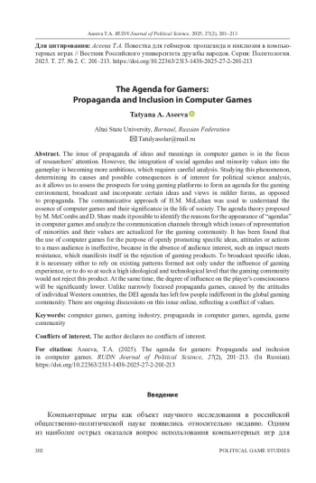 Вопрос пропаганды идей и смыслов в компьютерных играх находится в центре внимания исследователей. Однако интеграция социальных повесток в игровой процесс приобретает более масштабный характер, что требует внимательного анализа. Изучение данного явления, определение его причин и возможных последствий представляет интерес для политологического анализа, так как позволяет оценить перспективы использования игровых платформ для формирования повестки для игровой среды, трансляции и инкорпорации определенных идей и взглядов в более мягких формах в отличие от пропаганды. Для понимания сути компьютерных игр и их значения в жизни общества использовался коммуникативный подход Г. М. Маклюэна. Теория повестки дня, предложенная М. Маккомбсом и Д. Шоу, дала возможность выявить причины появления в компьютерных играх «повестки» и проанализировать коммуникационные каналы, посредством которых для игрового сообщества актуализируются вопросы репрезентации меньшинств и их ценностей. Обнаружено, что использование компьютерных игр в целях открытой пропаганды конкретных идей, установок или действий для массовой аудитории, неэффективно, так как при отсутствии заинтересованности аудитории такое воздействие встречает сопротивление, которое проявляется в отказе от игровой продукции. Для того чтобы транслировать конкретные идеи, необходимо либо опираться на уже существующие паттерны, сформированные не только под воздействием игрового опыта, либо делать это на таком высоком идейно-технологическом уровне, чтобы игровое комьюнити не отторгло данный продукт. При этом степень влияния на сознание игрока будет значительно ниже. В отличие от узконаправленных игр пропагандистского характера игры с «повесткой» смогли потрясти гейм-сообщество и актуализировать заданную проблематику. Вызванная установками отдельных западных стран, DEI-повестка мало кого оставила равнодушным в мировом игровом сообществе. В сети не утихают дискуссии по данному вопросу, что отражает ценностный конфликт.