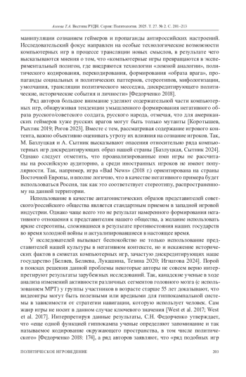 Компьютерные игры как объект научного исследования в российской общественно- политической науке появились относительно недавно. Одним из наиболее острых оказался вопрос использования компьютерных игр для манипуляции сознанием геймеров и пропаганды антироссийских настроений.