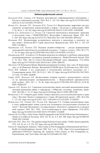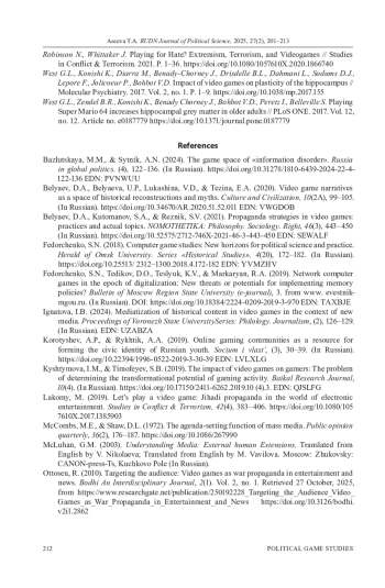 1. Базлуцкая М.М., Сытник А.Н. Игровое пространство “информационного беспорядка” // Россия в глобальной политике. 2024. № 4. С. 122-136. DOI: 10.31278/1810-6439-2024-22-4-122-136 EDN: PVNWUU
