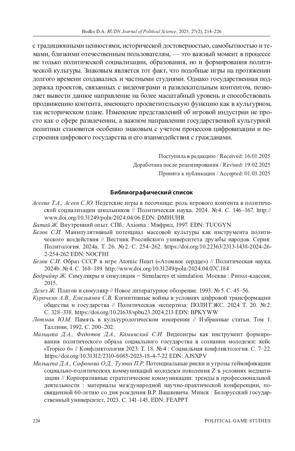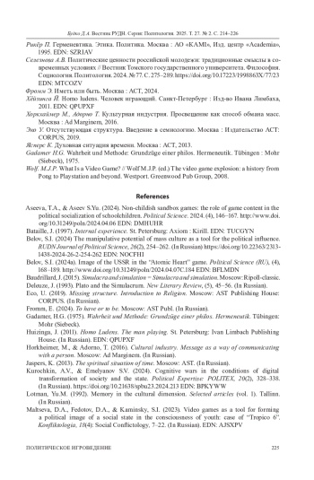 1. Асеева Т.А., Асеев С.Ю. Недетские игры в песочнице: роль игрового контента в политической социализации школьников // Политическая наука. 2024. № 4. С. 146-167. http://www. DOI: 10.31249/poln/2024.04.06 EDN: DMHUHR