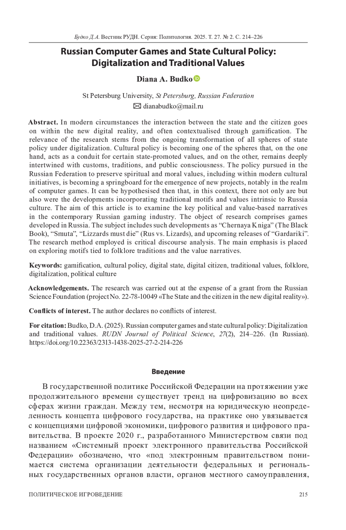 Видеоигры - значимый инструмент воздействия на процессы трансформации массового сознания посредством интерактивных символов и нарративов. Выявлены и систематизированы политические образы России, встроенные в их структуру, а также разработаны стратегические подходы к превенции информационных рисков и оптимизации социально-политических коммуникаций. В качестве эмпирического материала исследования рассмотрены зарубежные видеоигры, выпущенные в период с 2014 по 2024 г. и содержащие прямые референции к событиям, происходящим на территории Украины. Методология представленной статьи основана на синтезе нарративного, семиотического и дискурс-анализа игровых аннотаций, алгоритмического изучения игровых механик, экспертных оценок и лонгитюдного мониторинга. Выявлена значительная трансформация репрезентации конфликта в видеоигровом пространстве. До 2014 г. украинский сегмент зарубежной игровой индустрии сохранял культурную и тематическую связь с постсоветским пространством, однако в последующие годы вектор нарративов сместился в сторону формирования антагонистического образа России. В играх, выпущенных после 2022 г., зафиксировано систематическое внедрение антироссийских символов, что свидетельствует о превращении видеоигр в действенный инструмент информационного противостояния. В качестве стратегического ответа на данные вызовы авторами предложена целостная программа развития российской игровой индустрии. Она включает ряд ключевых инициатив: создание грантовых программ, ориентированных на разработку патриотически направленных игровых проектов; интеграцию образовательных элементов в игровые механики; расширение международного сотрудничества в рамках БРИКС и ШОС, а также правовое регулирование политического контента в видеоиграх. Комплексная реализация данных мер направлена на укрепление цифрового суверенитета России в условиях современной геополитической турбулентности.