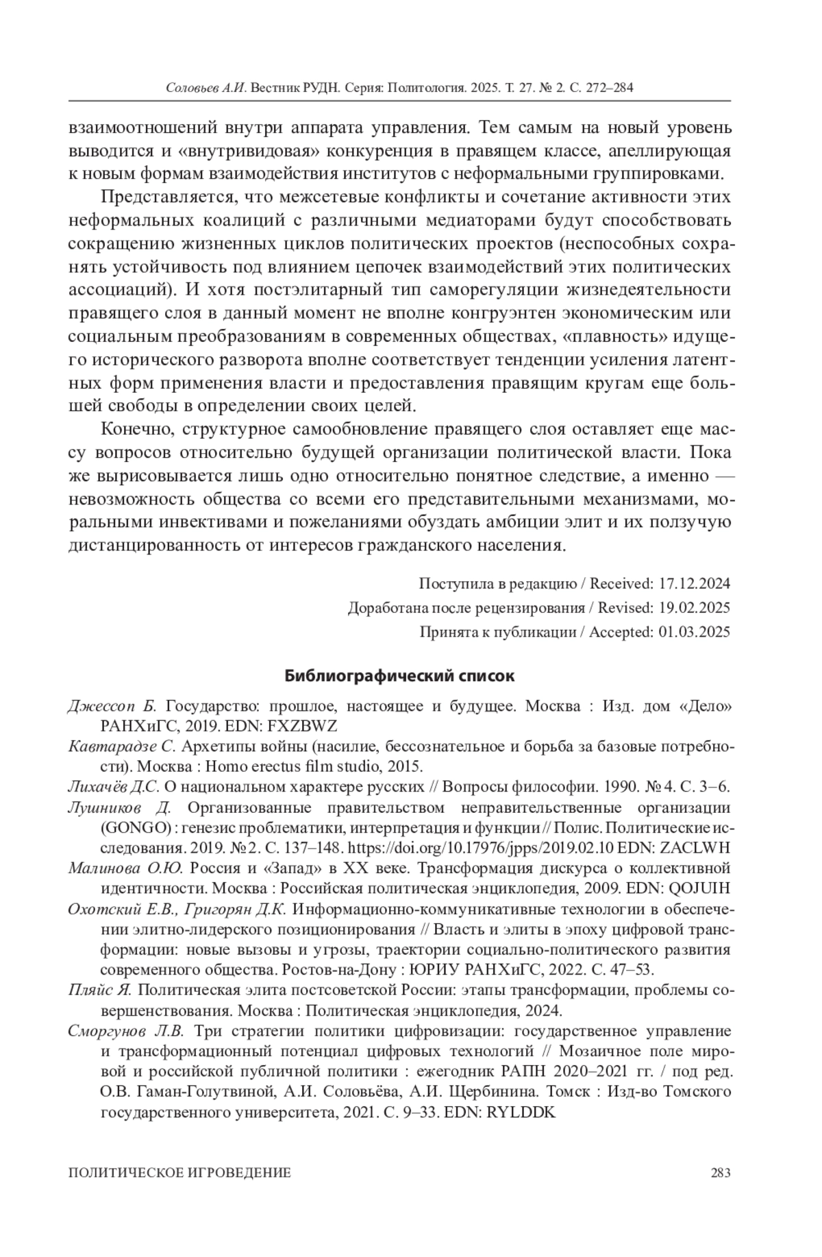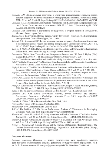 7. Пляйс Я. Политическая элита постсоветской России: этапы трансформации, проблемы совершенствования. Москва: Политическая энциклопедия, 2024.