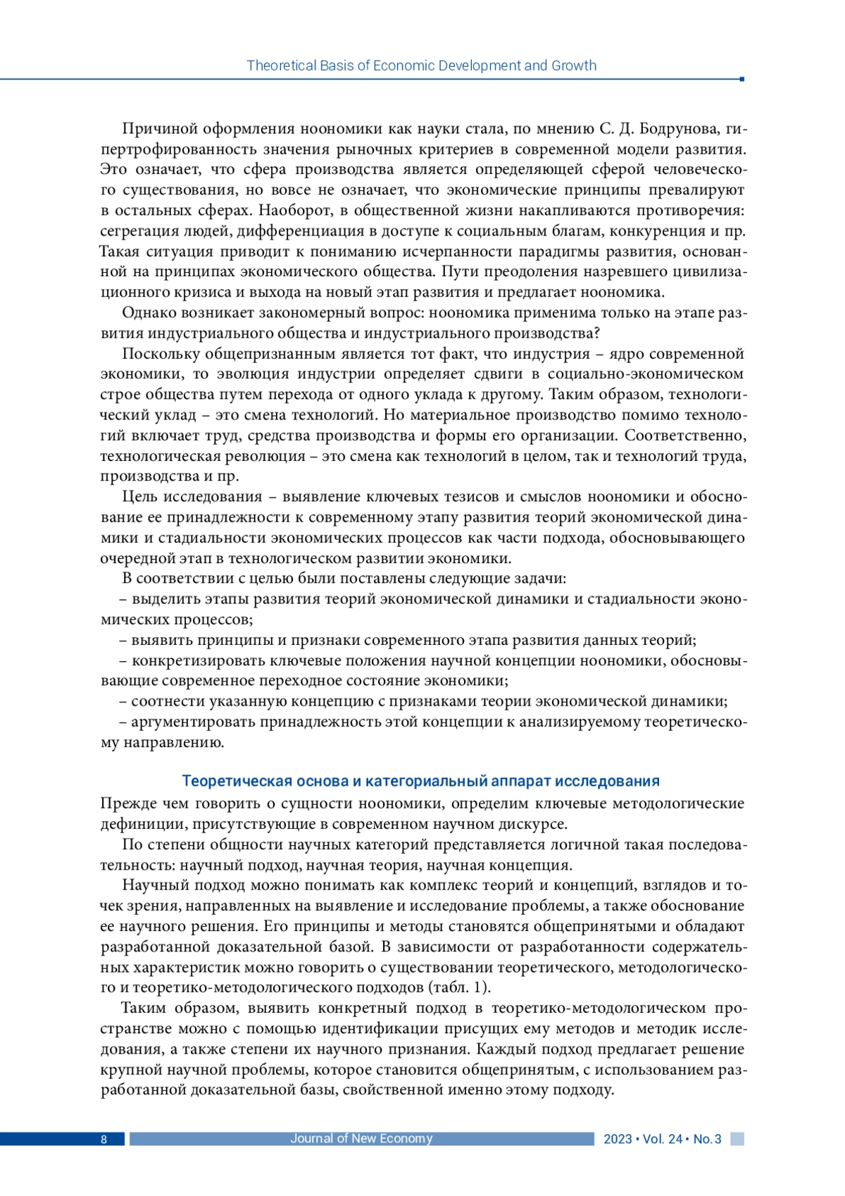 В научном экономическом дискурсе сформировался определенный пул теорий и концепций, которые считаются общепринятыми, имеющими разработанную доказательную базу, этапы формирования, развитые научные школы и пр. Однако, как показывает история экономической мысли, не всегда в своем генезисе данные теории имели однозначную коннотацию и контекстуализацию. Возможно, в настоящее время мы становимся свидетелями формирования новой научной теории – ноономики. Статья посвящена изучению ее сущностных положений и смыслов и обоснованию ее принадлежности к современному этапу развития теорий экономической динамики и стадиальности экономических процессов. Методологической базой исследования послужили указанные теории. Методами работы выступили систематизация и обобщение в части раскрытия ключевых положений теорий экономической цикличности и динамики; логико-структурный и причинно-следственный анализ в части исследования эволюции базиса теорий технологического развития; метод конкретизации в части раскрытия сущностни ноономики. Выделены релевантные характеристики теорий экономической динамики и стадиальности экономических процессов и выполнен анализ ноономики в контексте данных характеристик. Показано, что рассмотренная научная концепция по основным критериям относится к разработкам, обосновывающим переходный этап экономического развития, и является частью указанных теорий. Подтверждена научная основа данной концепции. Результаты исследования вносят вклад в понимание перехода на следующий этап технологического развития экономики и общества в целом, расширяя границы научного познания через призму теорий экономической динамики