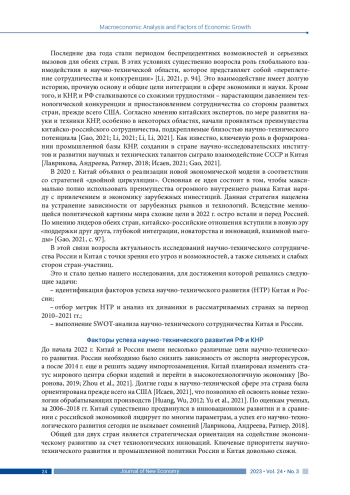 Вопросы научно-технического сотрудничества России и Китая являются предметом изучения как российских, так и китайских экономистов. Однако до сих пор незначительно число работ, посвященных систематизации ключевых индикаторов научнотехнического развития (НТР) указанных стран и влиянию на это развитие санкционного давления. Исследование направлено на восполнение данного пробела. Методология работы базируется на положениях макроэкономического анализа. Использовались методы ретроспективного и компаративного анализа, группировки и SWOT-анализа. Информационной базой послужили данные Росстата, Всемирного банка и Государственного статистического управления КНР. Определены факторы успеха НТР Китая и России, общим для обеих стран признан фактор высокого качества человеческого капитала. Проанализированы индикаторы НТР каждой страны за период 2010–2021 гг., такие как динамика доли расходов на НИОКР в ВВП, доли выданных патентов на изобретения к численности трудоспособного населения страны; доли экспорта и импорта высоких технологий в ВВП; международная публикационная активность и др., и выявлены национальные различия в их масштабах. Выполнен SWOT-анализ научно-технического сотрудничества России и Китая, показавший, что его основной угрозой является санкционное давление. Согласно заключению авторов, такое сотрудничество пока не способствует научно-техническому развитию РФ и, более того, может угрожать ее превращением в ресурсный придаток КНР. Полученные результаты могут быть полезны при разработке дорожных карт и стратегий реализации научно-технического сотрудничества КНР и РФ. Дальнейших исследований требует соответствующее взаимодействие в рамках ключевых высокотехнологичных отраслей