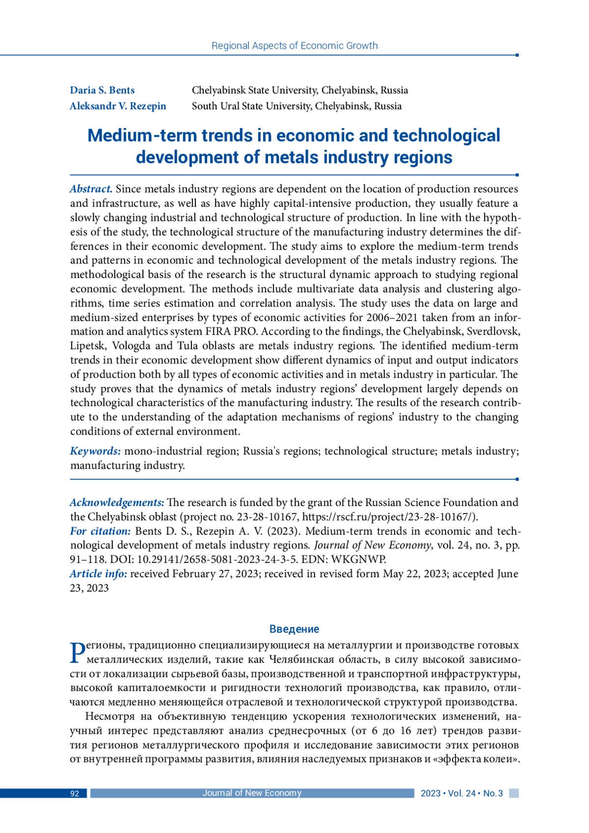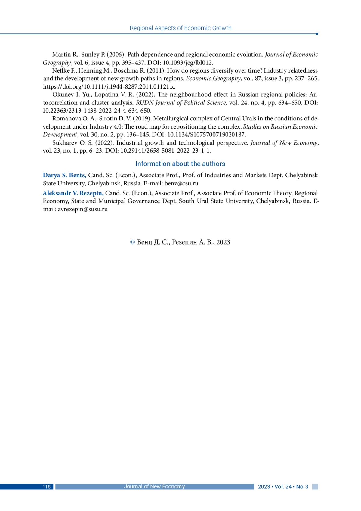 24. Bents D. S. (2022). Long-term trends in differentiation between regions: Sverdlovsk oblast vs Chelyabinsk oblast. Journal of New Economy, vol. 23, no. 2, pp. 102-124. DOI: 10.29141/2658-5081-2022-23-2-6 EDN: EQVMZL