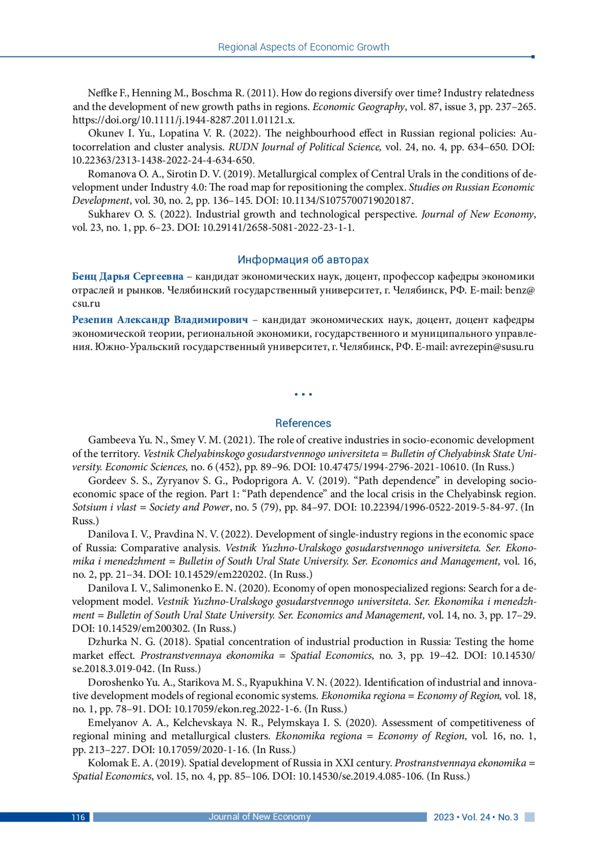 3. Данилова И. В., Правдина Н. В. (2022). Развитие монопрофильных регионов экономического пространства России: сравнительный анализ // Вестник Южно-Уральского государственного университета. Серия “Экономика и менеджмент”. Т. 16, № 2. С. 21-34. DOI: 10.14529/em220202 EDN: CRYRDB