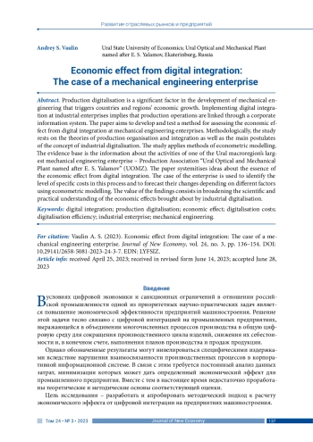 Цифровизация производства является значимым фактором развития отрасли машиностроения, создающим импульсы для экономического роста страны и регионов. Цифровая интеграция промышленного предприятия предполагает обеспечение взаимосвязи производственных операций посредством создания корпоративной информационной системы. Статья посвящена разработке и апробации методического подхода к оценке экономического эффекта от цифровой интеграции на предприятиях машиностроения. Методологическую основу исследования составили теории интеграции и организации производства, а также основные постулаты концепции цифровизации промышленности. Применялись методы эконометрического моделирования. Информационной базой выступили сведения о деятельности одного из крупнейших предприятий машиностроения Уральского макрорегиона – производственного объединения «Уральский оптико-механический завод» имени Э. С. Яламова». Систематизированы представления о сущности экономического эффекта от цифровой интеграции: выявлен уровень специфических издержек в данном процессе; на базе эконометрического моделирования выполнен прогноз их изменения в зависимости от различных факторов. Значимость полученных результатов состоит в расширении научного и практического понимания экономических эффектов от цифровизации промышленности.