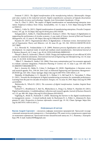 20. Guo X., Chen X. (2023). The impact of digital transformation on manufacturing-enterprise innovation: Empirical evidence from China. Sustainability, vol. 15, issue 4, 3124. DOI: 10.3390/su15043124 EDN: FPLZKQ