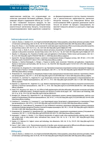 1. Lesme, H.; Rannou, C.; Famelart, M.-H., et al. Yogurts enriched with milk proteins: Texture properties, aroma release and sensory perception. Trends in Food Science and Technology. 2020. Vol. 98. Рp. 140-149. 10.1016/j.tifs.2020.02.006. DOI: 10.1016/j.tifs.2020.02.006.EDN EDN: YEJBFJ