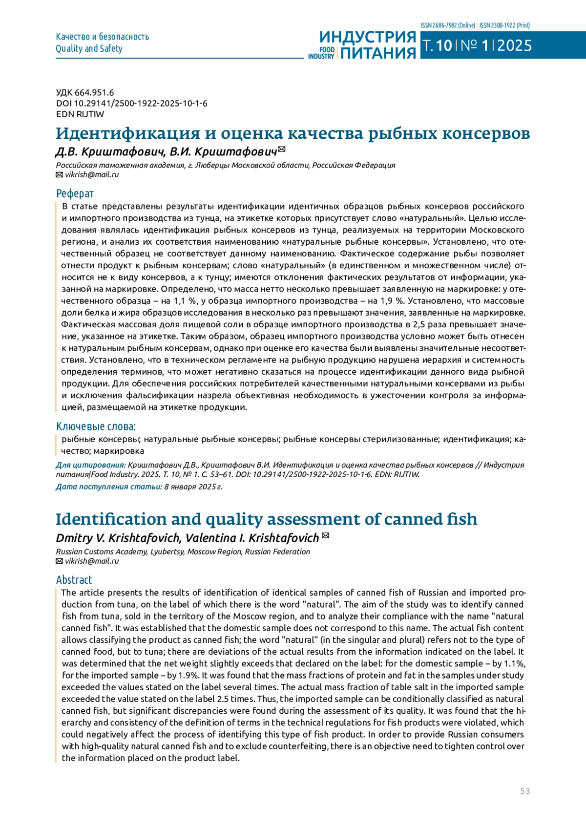 В статье представлены результаты идентификации идентичных образцов рыбных консервов российского и импортного производства из тунца, на этикетке которых присутствует слово «натуральный». Целью исследования являлась идентификация рыбных консервов из тунца, реализуемых на территории Московского региона, и анализ их соответствия наименованию «натуральные рыбные консервы». Установлено, что отечественный образец не соответствует данному наименованию. Фактическое содержание рыбы позволяет отнести продукт к рыбным консервам; слово «натуральный» (в единственном и множественном числе) относится не к виду консервов, а к тунцу; имеются отклонения фактических результатов от информации, указанной на маркировке. Определено, что масса нетто несколько превышает заявленную на маркировке: у отечественного образца – на 1,1 %, у образца импортного производства – на 1,9 %. Установлено, что массовые доли белка и жира образцов исследования в несколько раз превышают значения, заявленные на маркировке. Фактическая массовая доля пищевой соли в образце импортного производства в 2,5 раза превышает значение, указанное на этикетке. Таким образом, образец импортного производства условно может быть отнесен к натуральным рыбным консервам, однако при оценке его качества были выявлены значительные несоответствия. Установлено, что в техническом регламенте на рыбную продукцию нарушена иерархия и системность определения терминов, что может негативно сказаться на процессе идентификации данного вида рыбной продукции. Для обеспечения российских потребителей качественными натуральными консервами из рыбы и исключения фальсификации назрела объективная необходимость в ужесточении контроля за информацией, размещаемой на этикетке продукции.