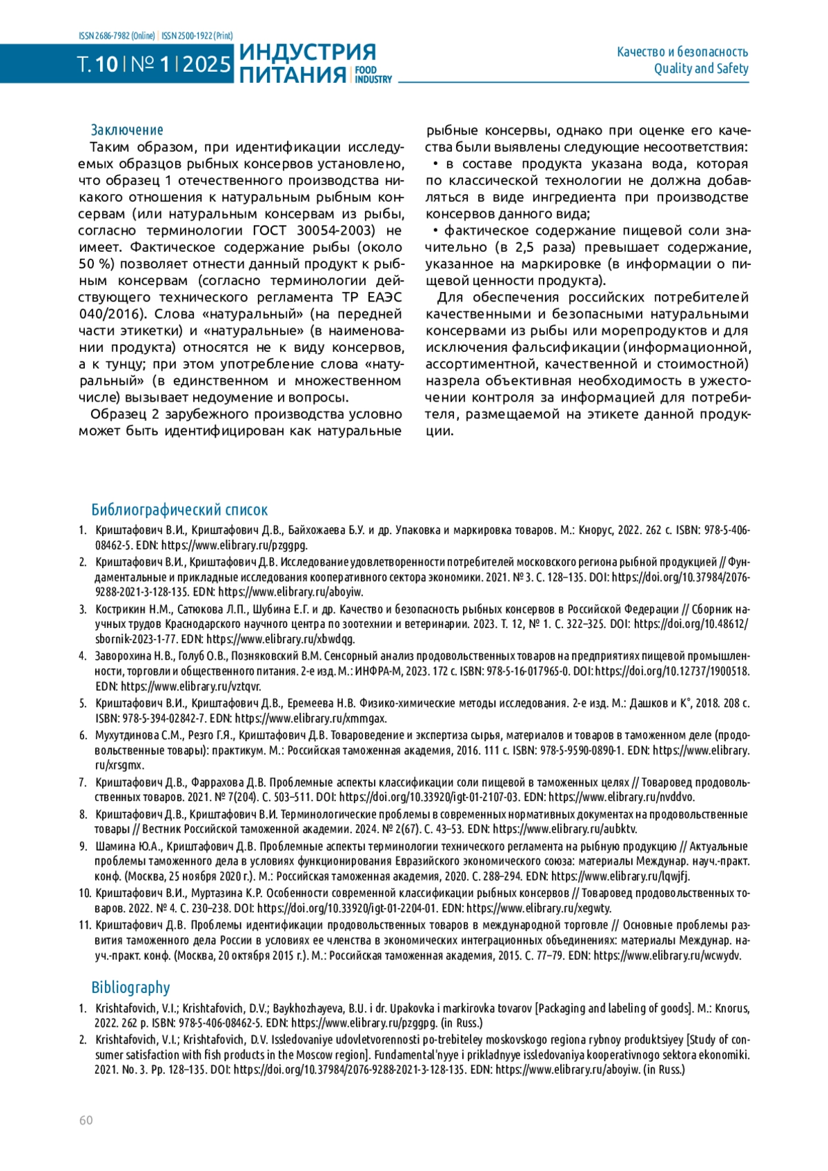 10. Криштафович В.И., Муртазина К.Р. Особенности современной классификации рыбных консервов // Товаровед продовольственных товаров. 2022. № 4. С. 230-238. 10.33920/igt-01-2204-01. DOI: 10.33920/igt-01-2204-01.EDN EDN: XEGWTY