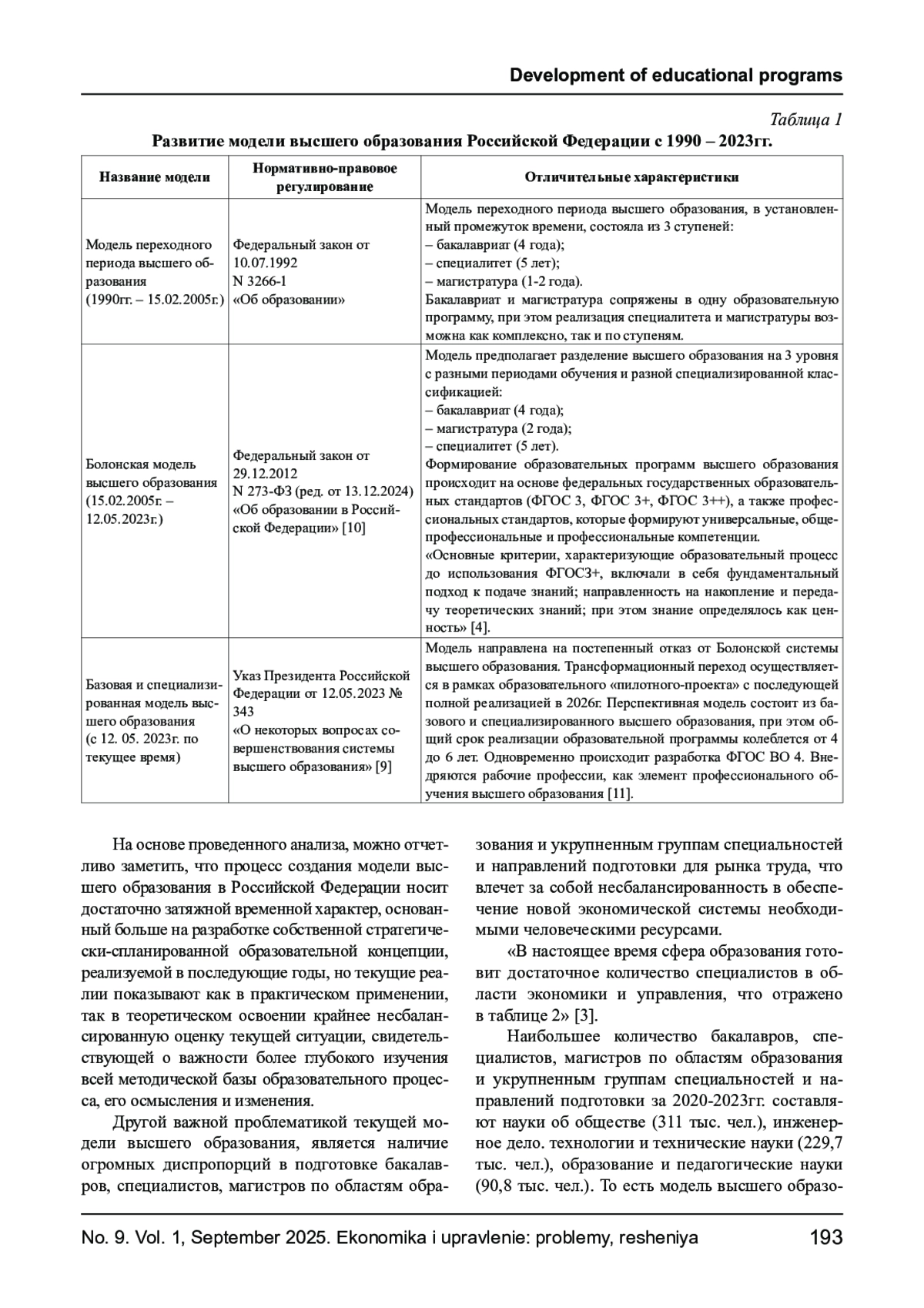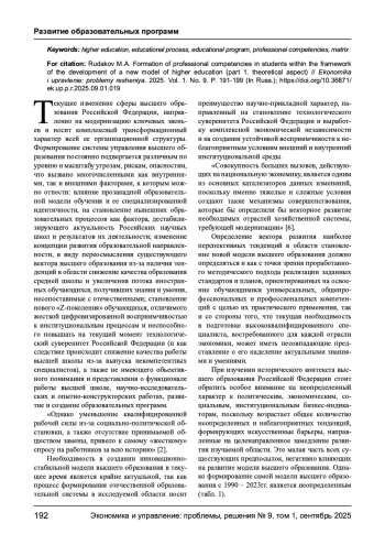 В статье рассматриваются вопросы изменения модели высшего образования Российской Федерации, а также динамичность её развития. Необходимость в становлении новой образовательной концепции в исследуемой сфере обусловлена своевременным решением текущих больших вызовов. Также эмпирически выявлена новая модель высшего образования Российской Федерации. Научная новизна работы состоит в формировании профессиональных компетенций у обучающихся за счет реализации методического подхода для образовательной программы высшего образования. Практическая значимость статьи состоит в разработке матрицы новой модели высшего образования Российской Федерации.