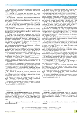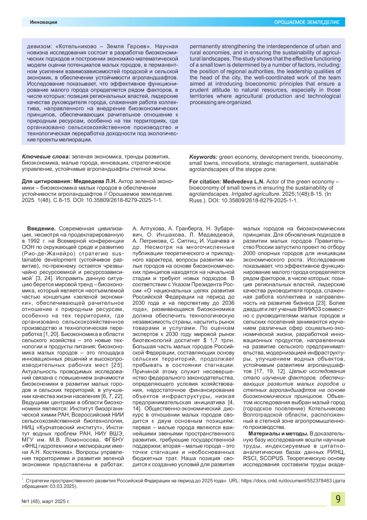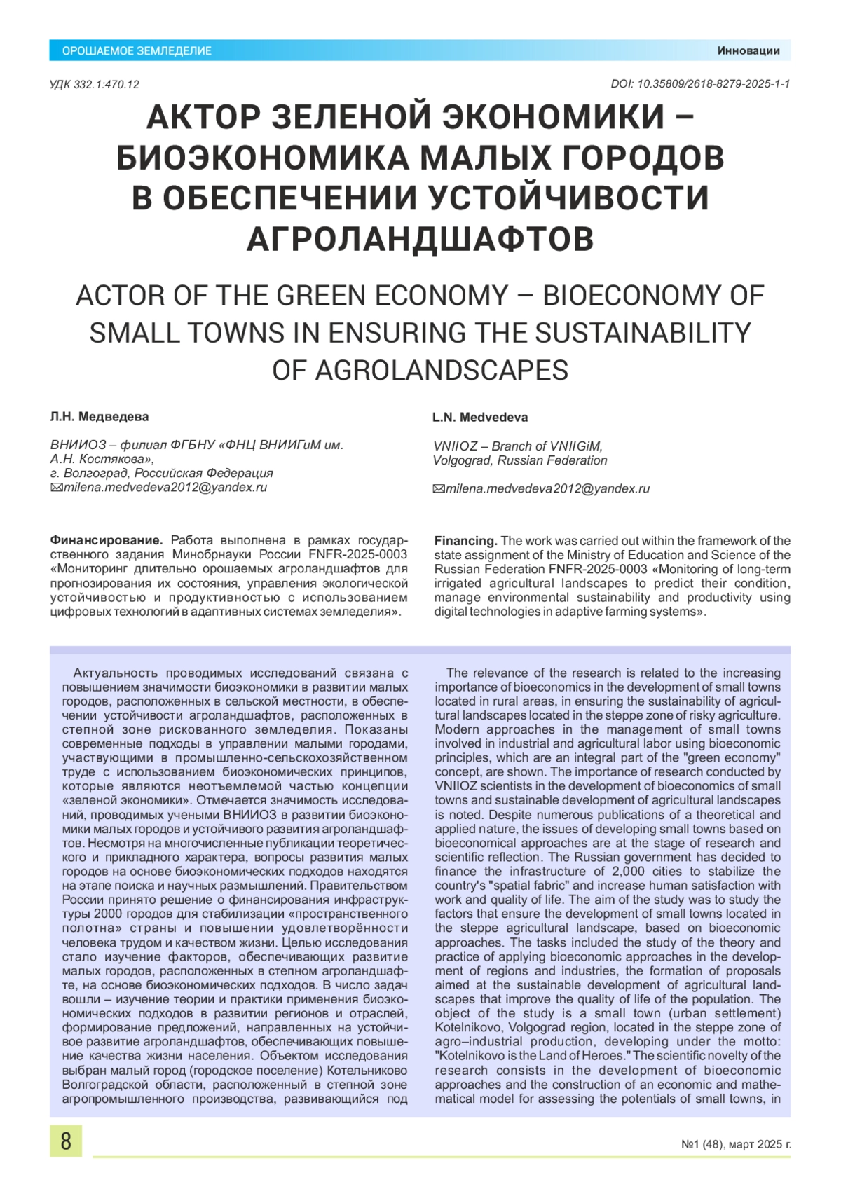 МЕДВЕДЕВА Л. Н. АКТОР ЗЕЛЕНОЙ ЭКОНОМИКИ – БИОЭКОНОМИКА МАЛЫХ ГОРОДОВ В ОБЕСПЕЧЕНИИ УСТОЙЧИВОСТИ АГРОЛАНДШАФТОВ // ОРОШАЕМОЕ ЗЕМЛЕДЕЛИЕ. 2025. № 1 (48)