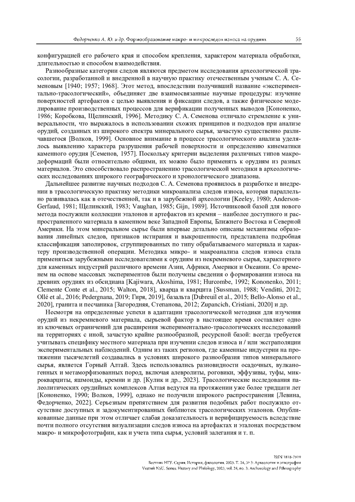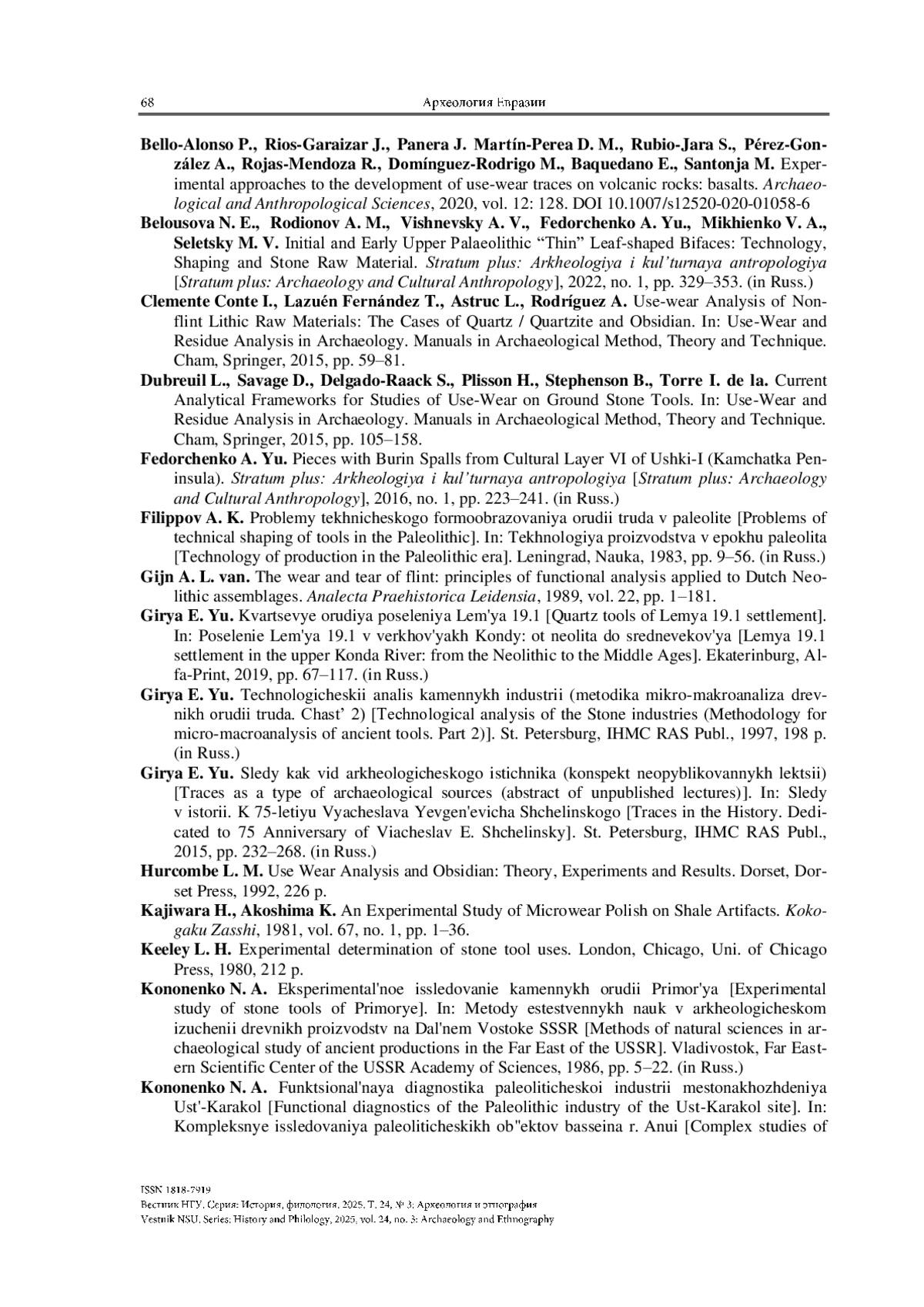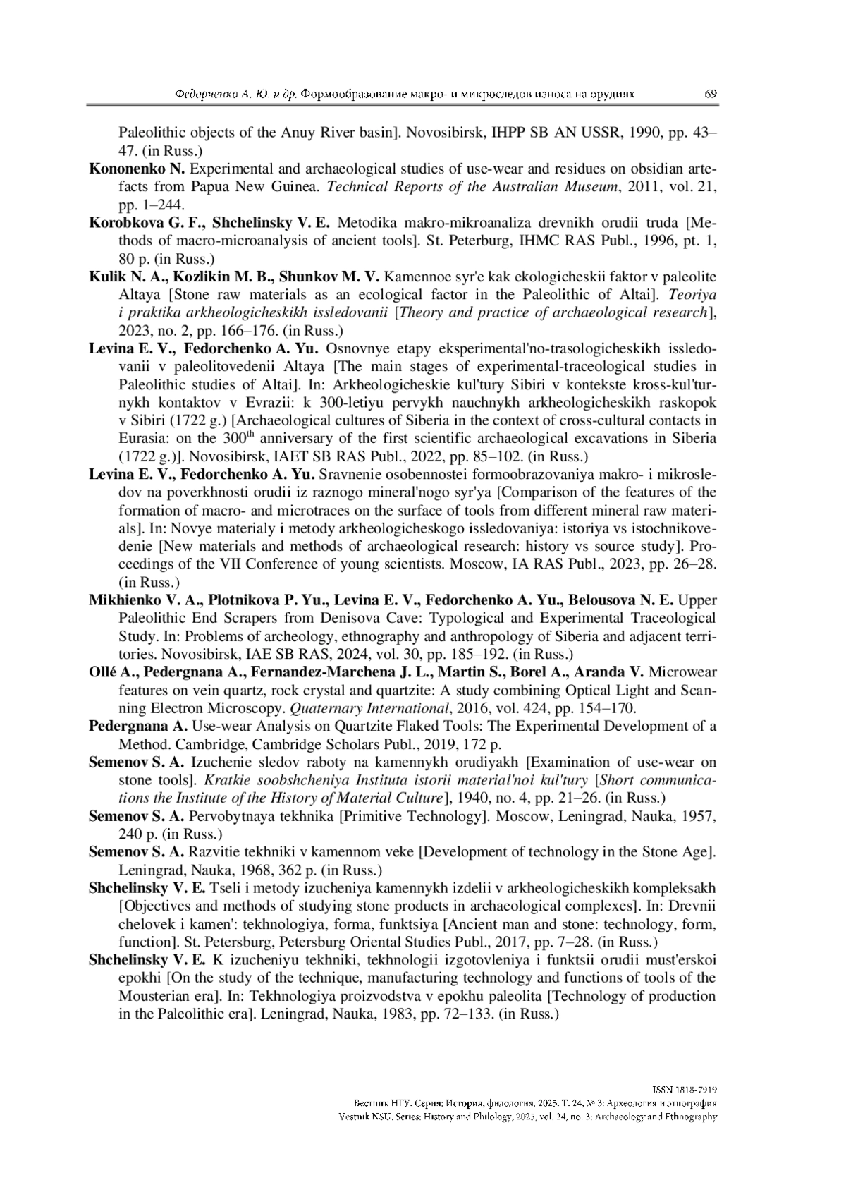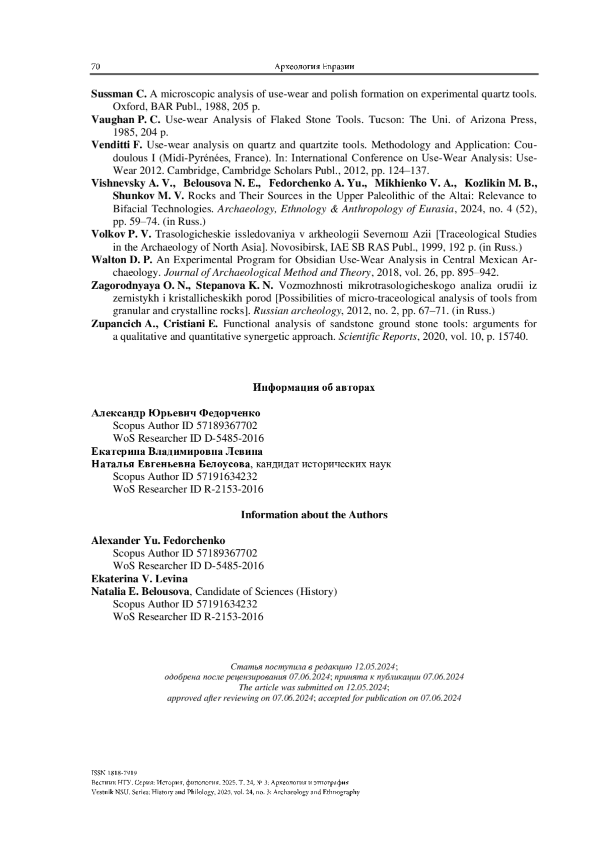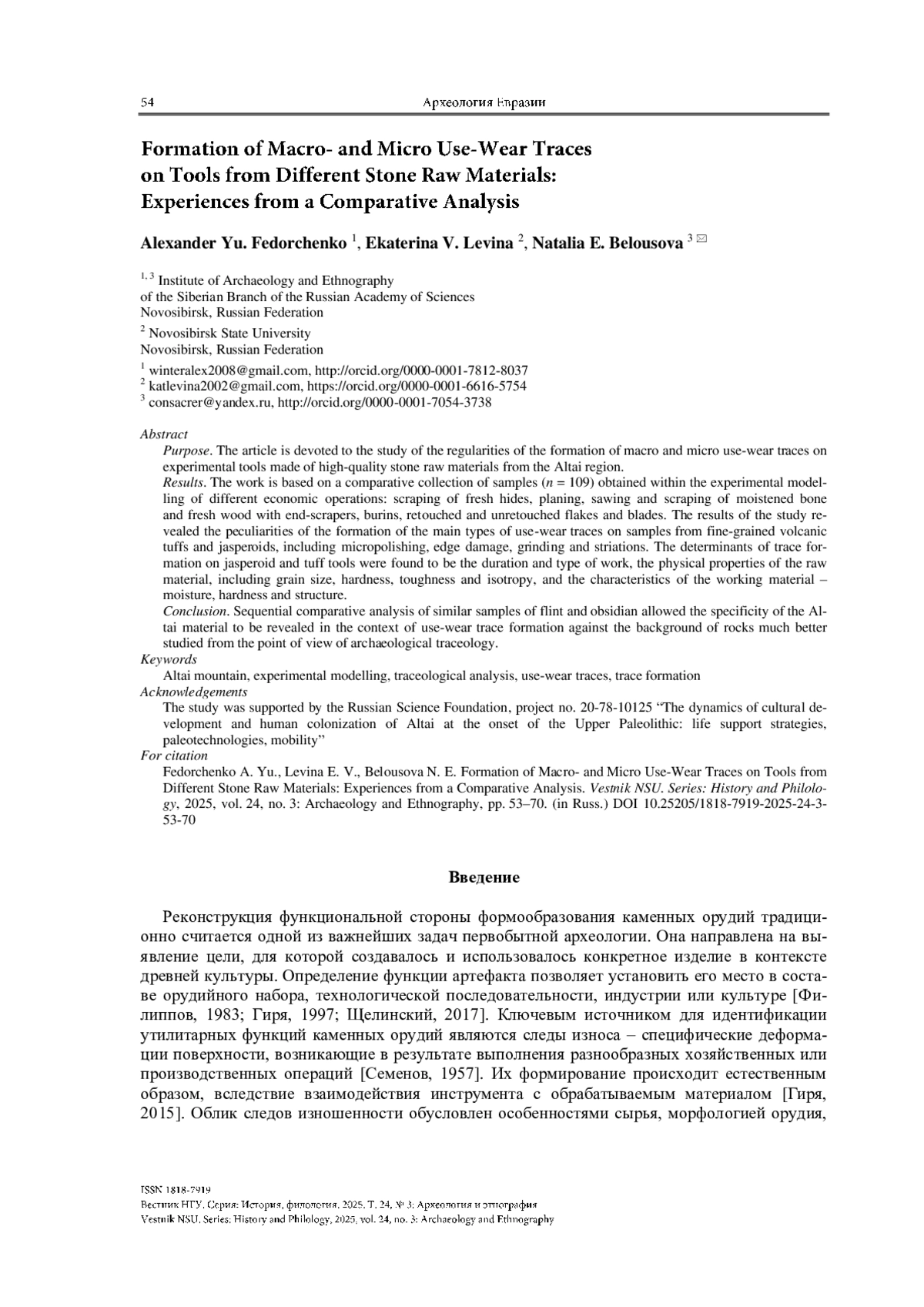 ЛЕВИНА Е. В., ФЕДОРЧЕНКО А. Ю., БЕЛОУСОВА Н. Е. ФОРМООБРАЗОВАНИЕ МАКРО- И МИКРОСЛЕДОВ ИЗНОСА НА ОРУДИЯХ ИЗ РАЗЛИЧНЫХ ПОРОД КАМЕННОГО СЫРЬЯ: ОПЫТ СРАВНИТЕЛЬНОГО АНАЛИЗА // ВЕСТНИК НГУ. СЕРИЯ: ИСТОРИЯ, ФИЛОЛОГИЯ. 2025. ТОМ 24, № 3