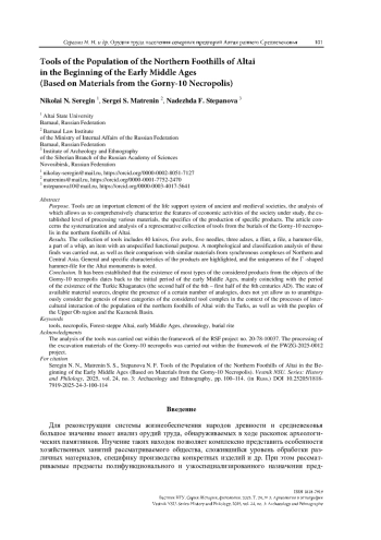 Статья: Орудия труда населения северных предгорий Алтая начала раннего Средневековья (по материалам некрополя Горный-10) (2025)