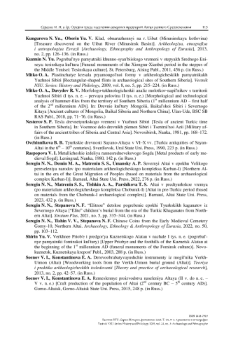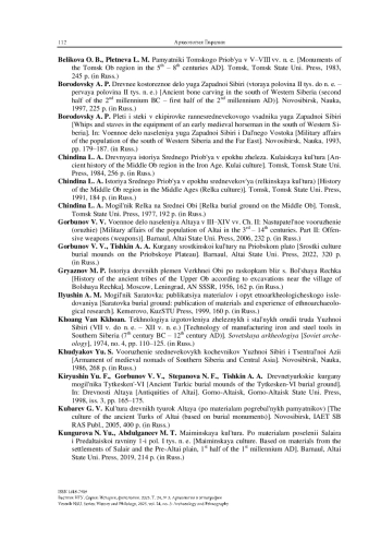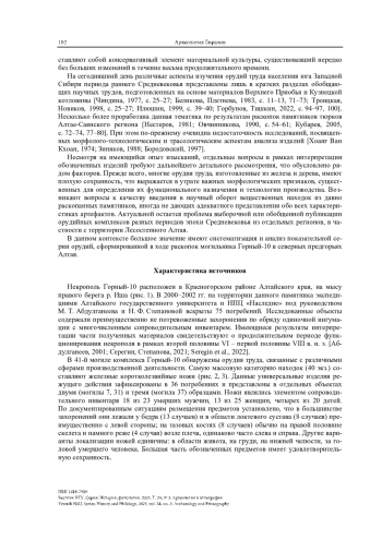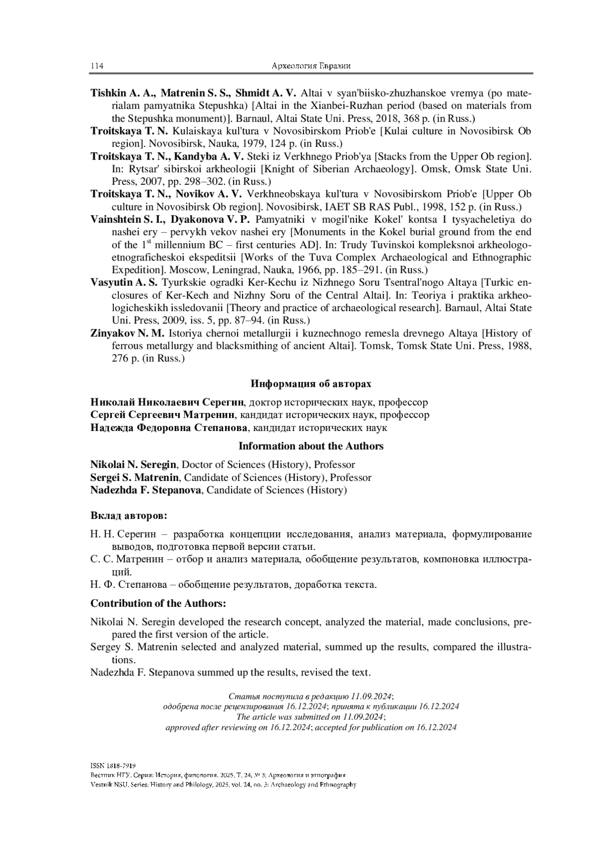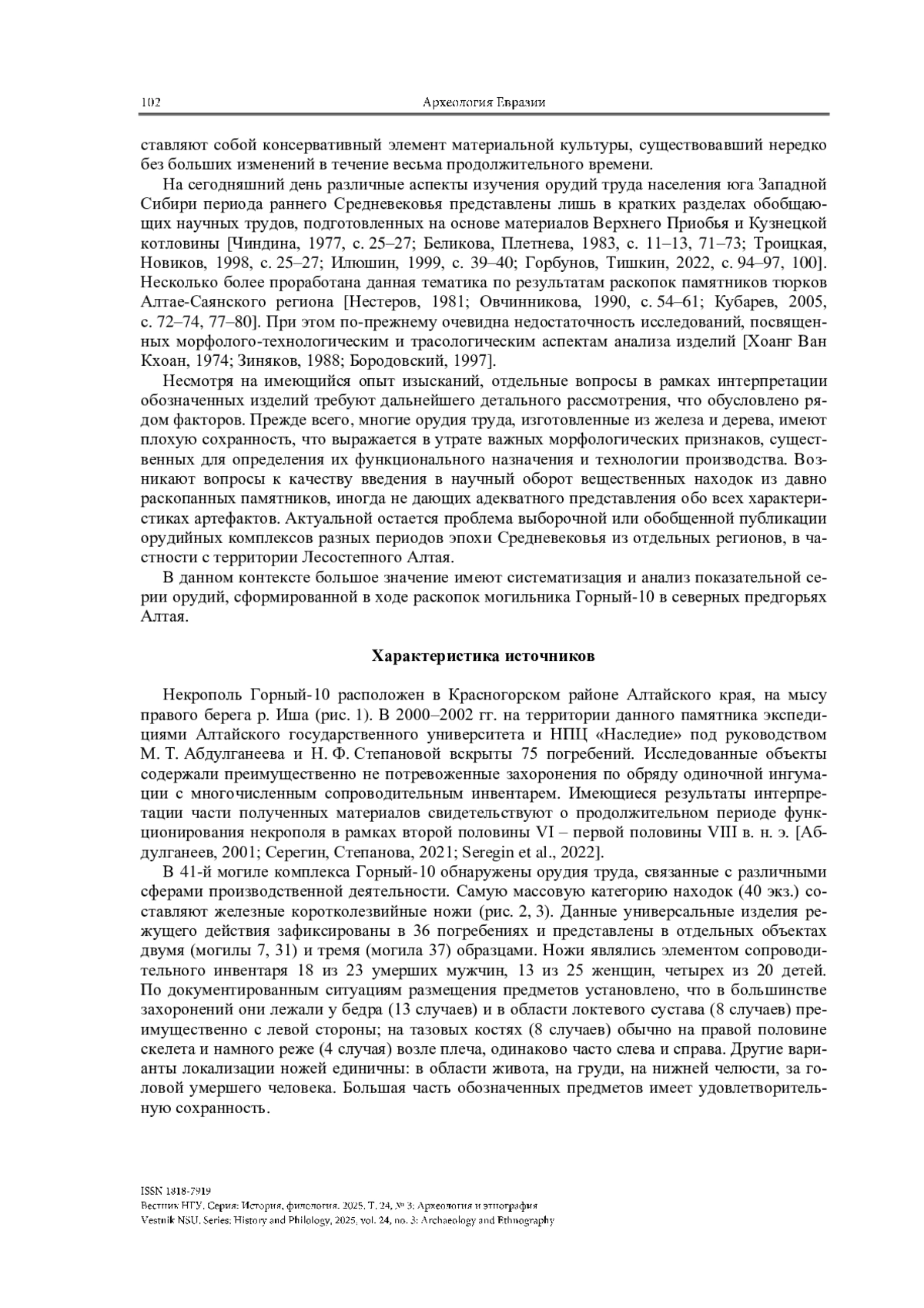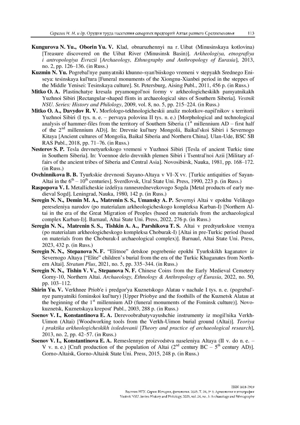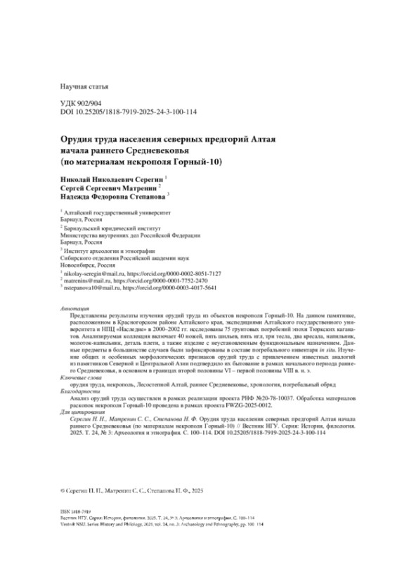 СЕРЕГИН Н. Н., МАТРЕНИН С. С., СТЕПАНОВА Н. Ф. ОРУДИЯ ТРУДА НАСЕЛЕНИЯ СЕВЕРНЫХ ПРЕДГОРИЙ АЛТАЯ НАЧАЛА РАННЕГО СРЕДНЕВЕКОВЬЯ (ПО МАТЕРИАЛАМ НЕКРОПОЛЯ ГОРНЫЙ-10) // ВЕСТНИК НГУ. СЕРИЯ: ИСТОРИЯ, ФИЛОЛОГИЯ. 2025. ТОМ 24, № 3