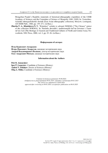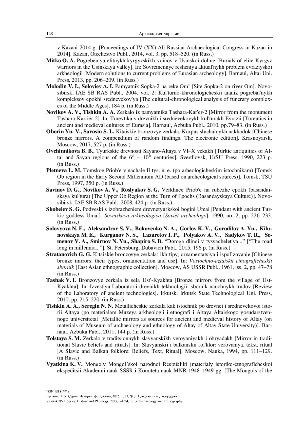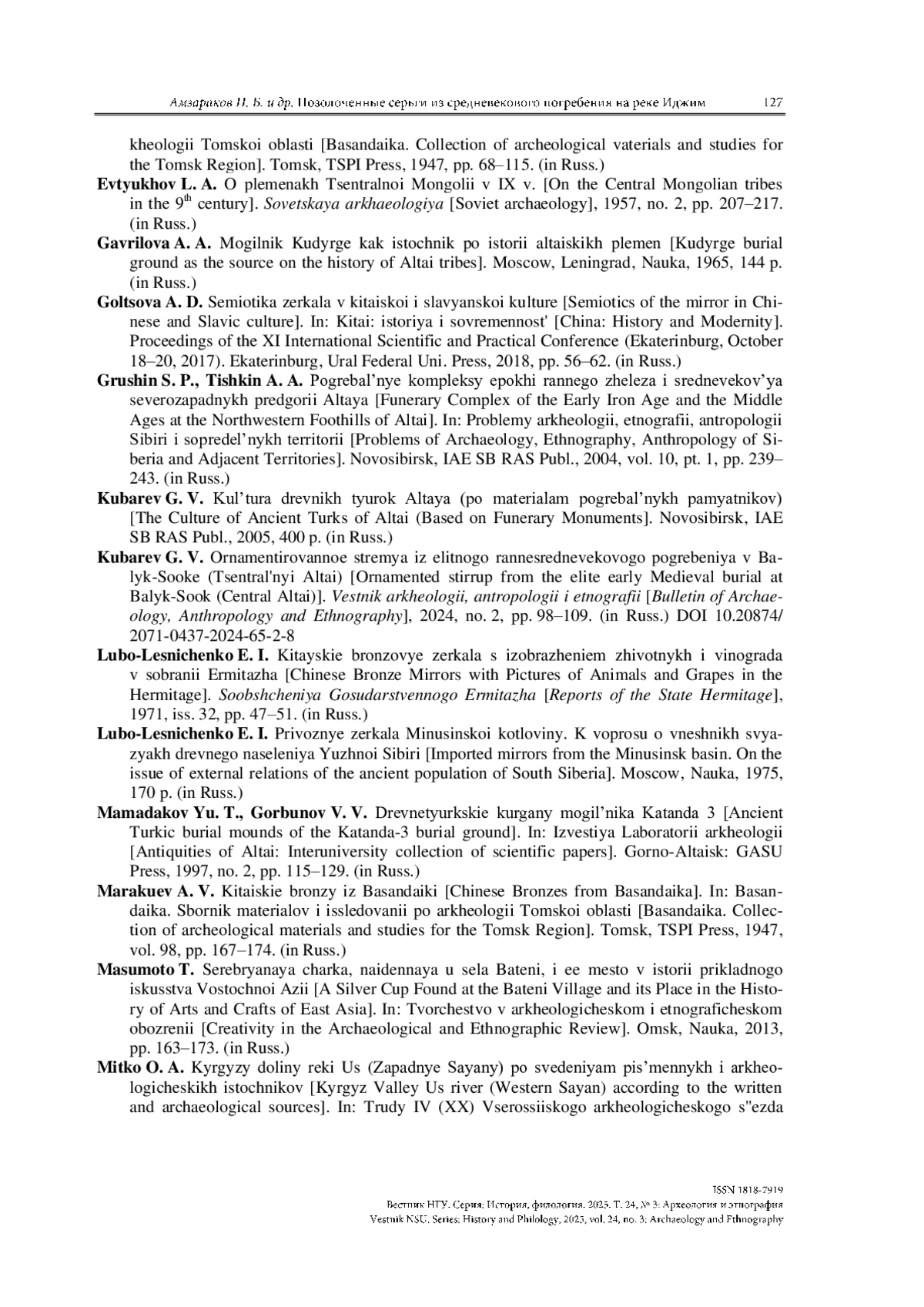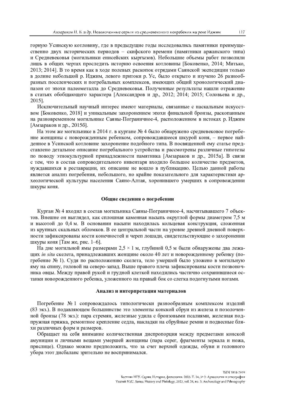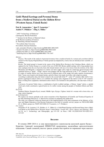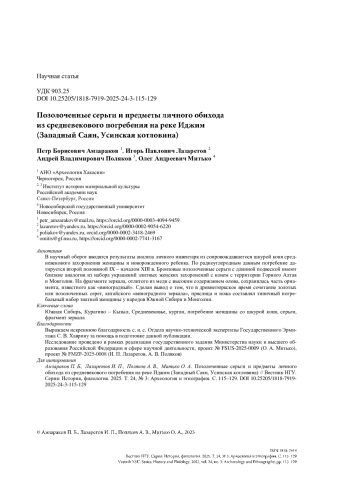 АМЗАРАКОВ П. Б., ЛАЗАРЕТОВ И. П., ПОЛЯКОВ А. В., МИТЬКО О. А. ПОЗОЛОЧЕННЫЕ СЕРЬГИ И ПРЕДМЕТЫ ЛИЧНОГО ОБИХОДА ИЗ СРЕДНЕВЕКОВОГО ПОГРЕБЕНИЯ НА РЕКЕ ИДЖИМ (ЗАПАДНЫЙ САЯН, УСИНСКАЯ КОТЛОВИНА) // ВЕСТНИК НГУ. СЕРИЯ: ИСТОРИЯ, ФИЛОЛОГИЯ. 2025. ТОМ 24, № 3