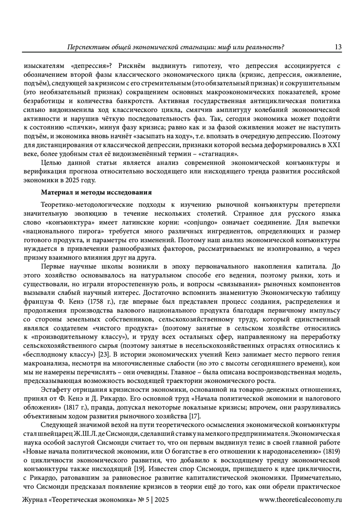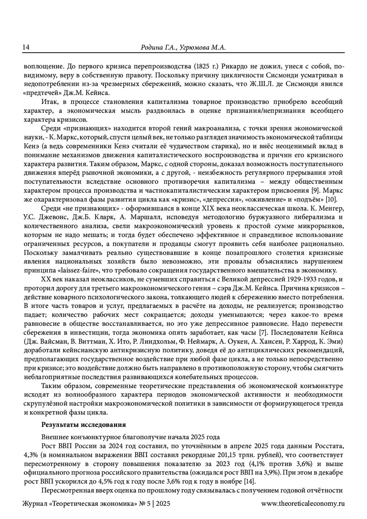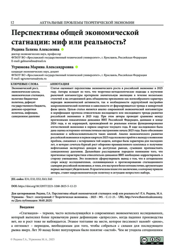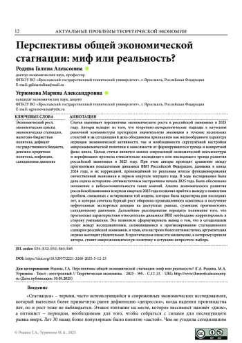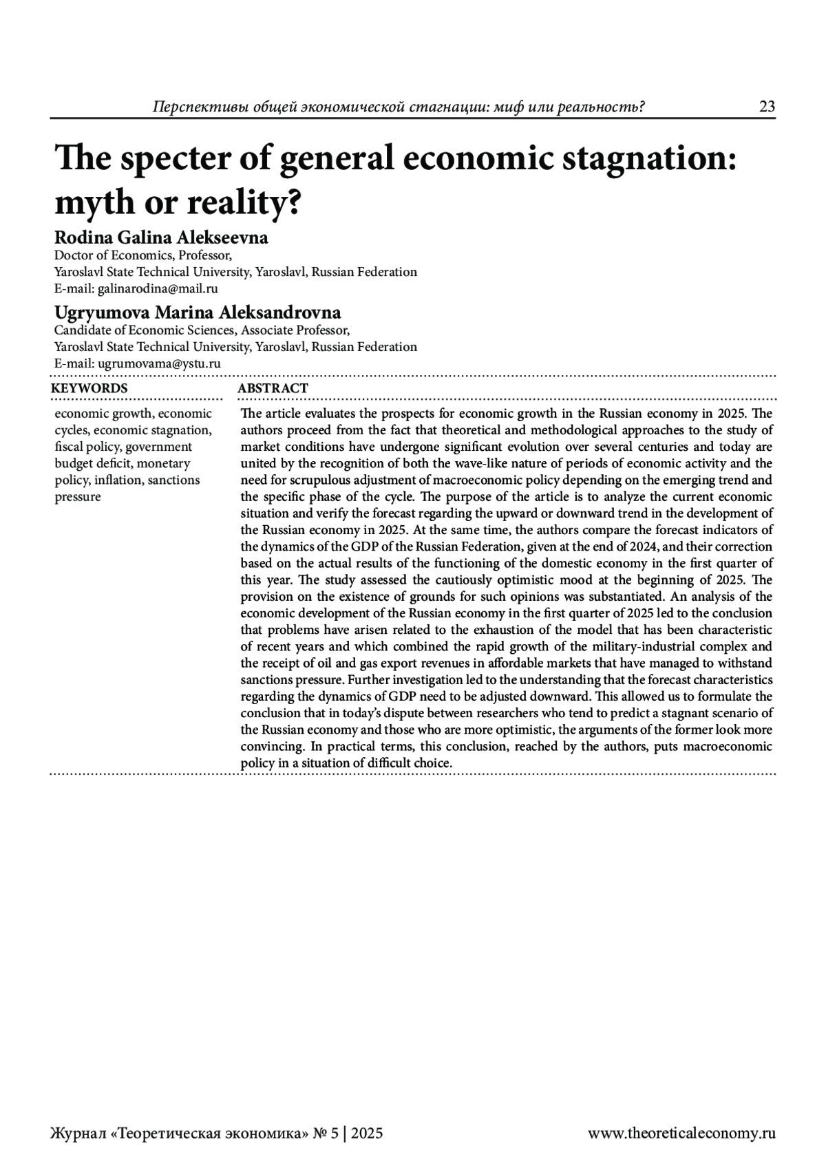Статья оценивает перспективы экономического роста в российской экономике в 2025 году. Авторы исходят из того, что теоретико-методологические подходы к изучению рыночной конъюнктуры претерпели значительную эволюцию в течение нескольких столетий и на сегодняшний день объединены признанием как волнообразного характера периодов экономической активности, так и необходимости скрупулёзной настройки макроэкономической политики в зависимости от формирующегося тренда и конкретной фазы цикла. Целью статьи является анализ современной экономической конъюнктуры и верификация прогноза относительно восходящего или нисходящего тренда развития российской экономики в 2025 году. При этом авторы проводят сравнение между прогнозными показателями динамики ВВП Российской Федерации, данными в конце 2024 года, и их коррекцией, произведённой по реальным итогам функционирования отечественной экономики в первом квартале текущего года. В ходе исследования была дана оценка осторожно-оптимистичным настроениям начала 2025 года. Было обосновано положение о небезосновательности таких мнений. Анализ экономического развития российской экономики в первом квартале 2025 года позволил прийти к выводу о появлении проблем, связанных с исчерпанием той модели, которая была характерна для последних лет, и которая сочетала бурный рост оборонно-промышленного комплекса и получение нефтегазовых экспортных доходов на доступных рынках, сумевших противостоять санкционному давлению. Дальнейшее расследование породило понимание того, что прогнозные характеристики относительно динамики ВВП необходимо корректировать в сторону уменьшения. Это позволило сформулировать вывод о том, что в сегодняшнем споре между исследователями, склоняющимися к прогнозированию стагнационного сценария российской экономики, и теми, кто настроен более оптимистично, аргументация первых выглядит убедительнее. В практическом плане это заключение, к которому пришли авторы, ставит макроэкономическую политику в ситуацию непростого выбора.