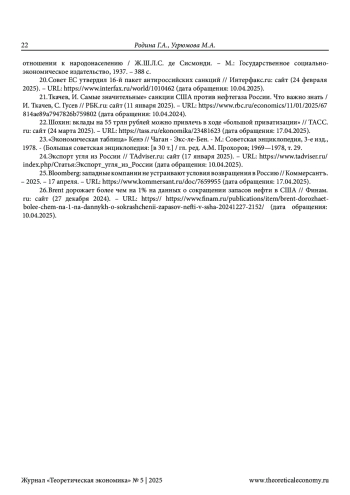 3. Гринкевич, В. Баррель упал ниже прогнозов: чем грозит российской экономике дешевая нефть / В. Гринкевич. - Текст: электронный // Профиль. - 2025. - 18 апреля. - URL: https://profile.ru/economy/barrel-upal-nizhe-prognozov-chem-grozit-rossijskoj-ekonomike-deshevaya-neft-1690964/ (дата обращения: 19.04.2025).