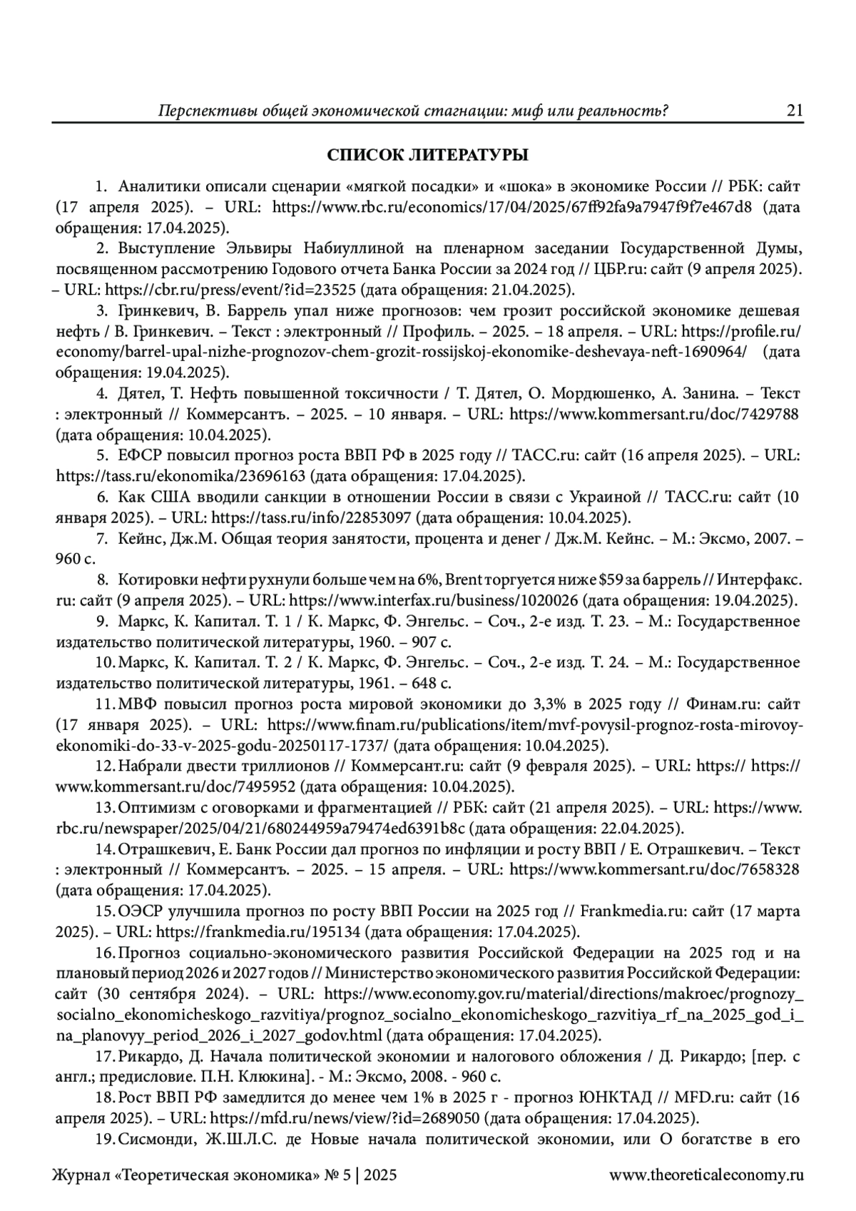1. Аналитики описали сценарии “мягкой посадки” и “шока” в экономике России // РБК: сайт (17 апреля 2025). - URL: https://www.rbc.ru/economics/17/04/2025/67ff92fa9a7947f9f7e467d8 (дата обращения: 17.04.2025).