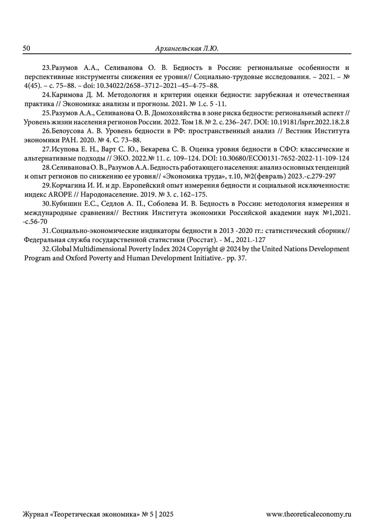 30. Кубишин Е.С., Седлов А. П., Соболева И. В. Бедность в России: методология измерения и международные сравнения// Вестник Института экономики Российской академии наук №1,2021. -с.56-70. EDN: POWMEL
