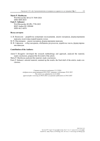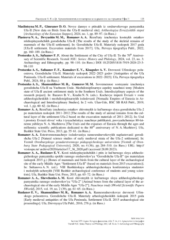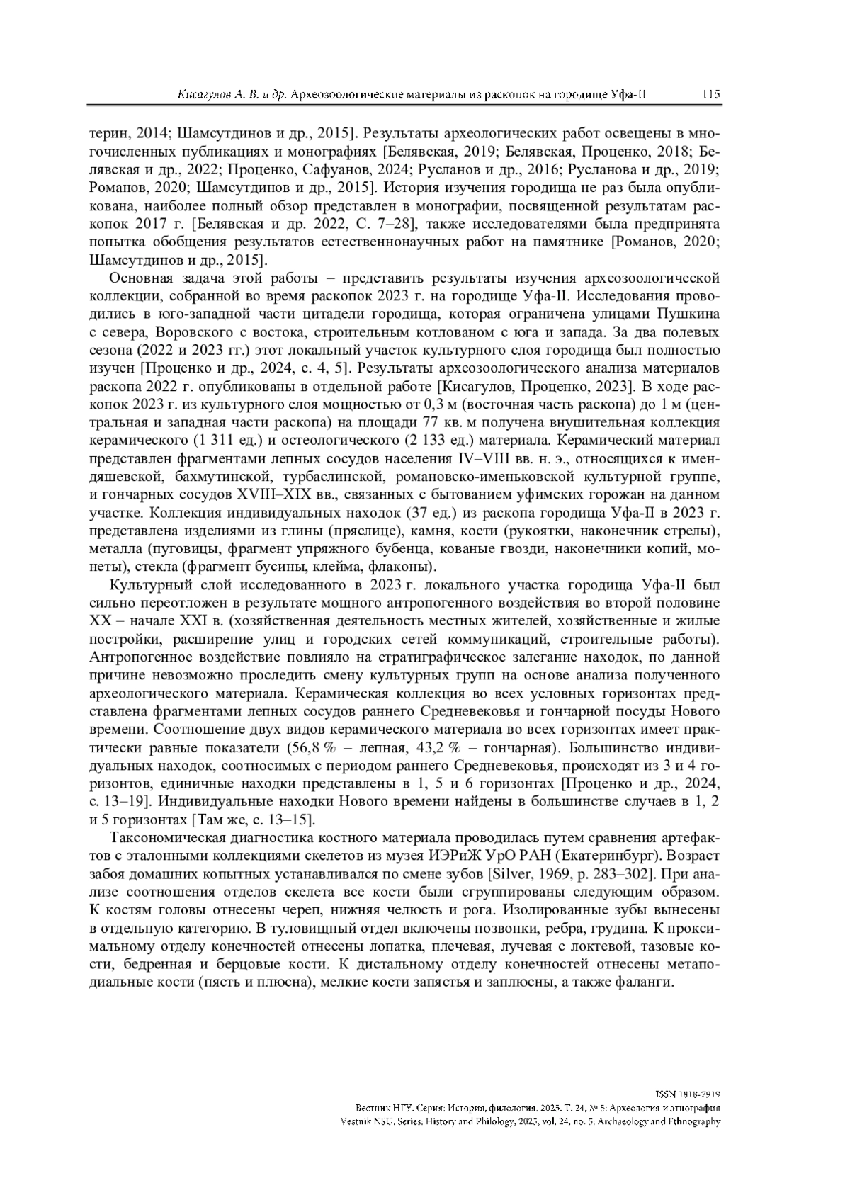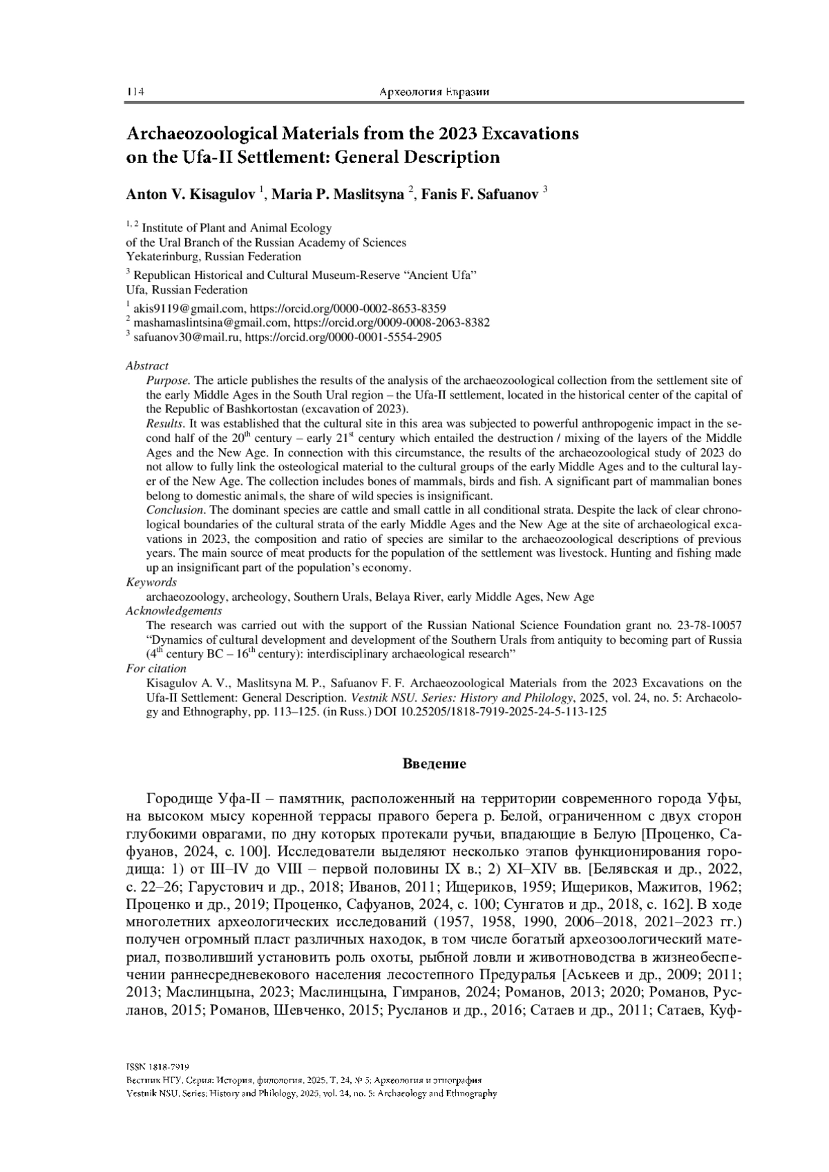 КИСАГУЛОВ А. В., МАСЛИНЦЫНА М. П., САФУАНОВ Ф. Ф. АРХЕОЗООЛОГИЧЕСКИЕ МАТЕРИАЛЫ ИЗ РАСКОПОК 2023 ГОДА НА ГОРОДИЩЕ УФА-II: ОБЩАЯ ХАРАКТЕРИСТИКА // ВЕСТНИК НГУ. СЕРИЯ: ИСТОРИЯ, ФИЛОЛОГИЯ. 2025. ТОМ 24, № 5