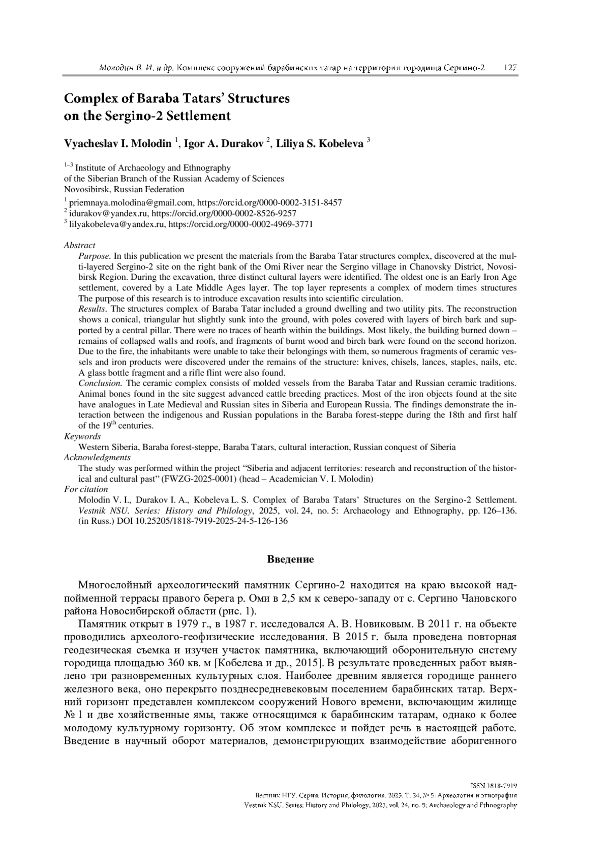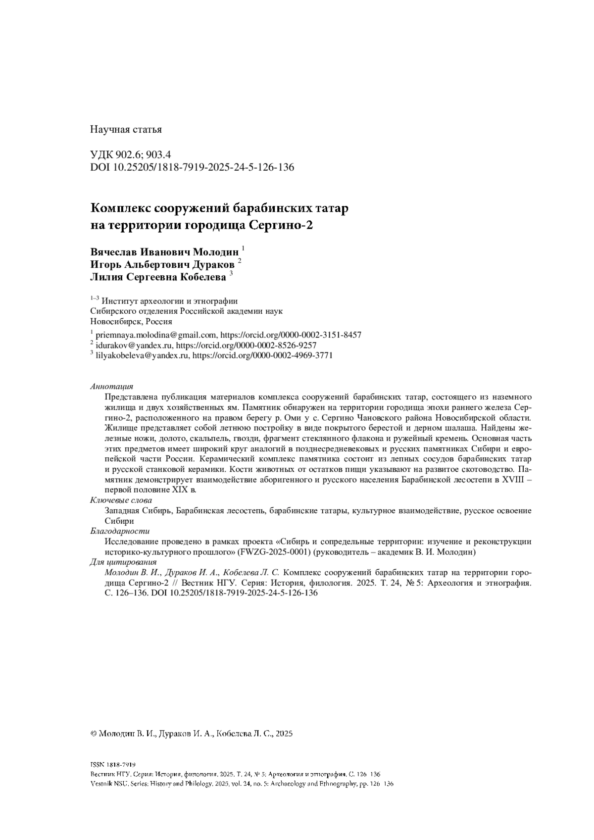 7. Кобелева Л. С., Дураков И. А., Молодин В. И., Демахина М. С. Комплексные исследования городища Сергино-2 на реке Оми // Проблемы археологии, этнографии, антропологии Сибири и сопредельных территорий. Новосибирск: ИАЭТ СО РАН, 2015. Т. 21. C. 267-271.