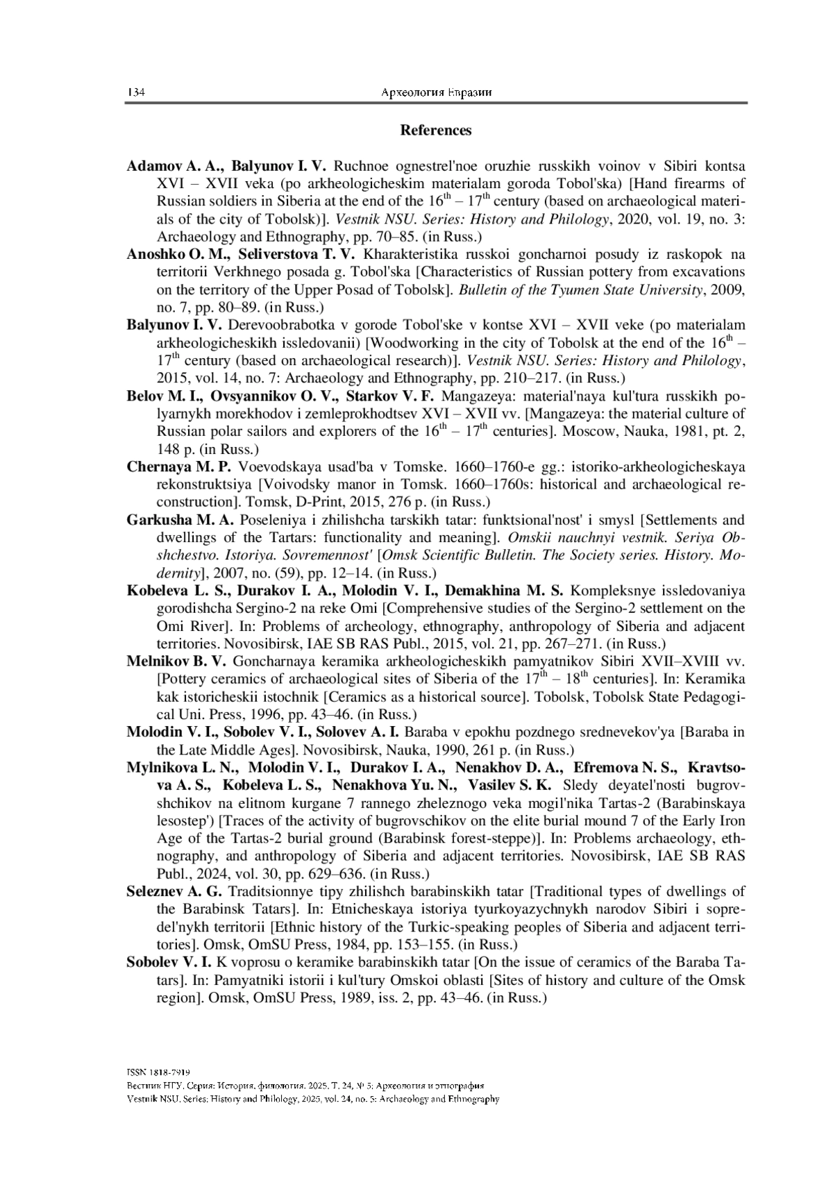 1. Адамов А. А., Балюнов И. В. Ручное огнестрельное оружие русских воинов в Сибири конца XVI - XVII века (по археологическим материалам города Тобольска) // Вестник НГУ. Серия: История, филология. 2020. Т. 19, № 3: Археология и этнография. С. 70-85.