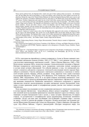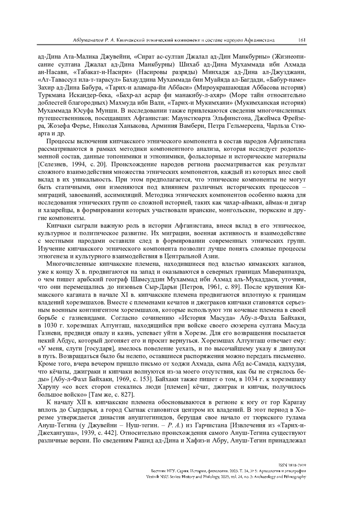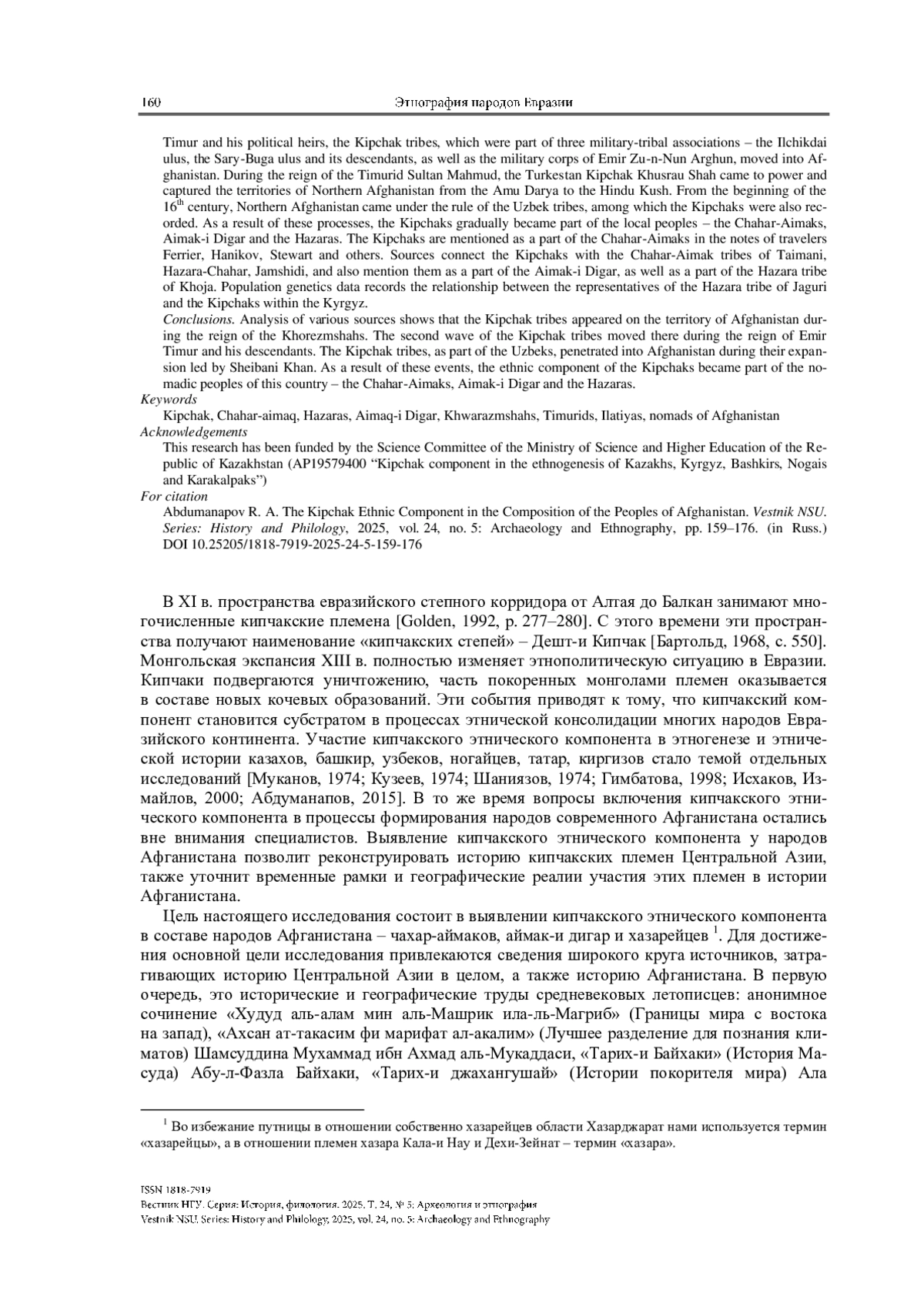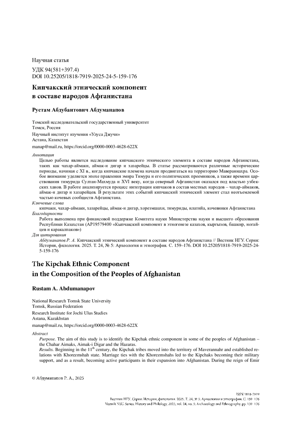 АБДУМАНАПОВ Р. А. КИПЧАКСКИЙ ЭТНИЧЕСКИЙ КОМПОНЕНТ В СОСТАВЕ НАРОДОВ АФГАНИСТАНА // ВЕСТНИК НГУ. СЕРИЯ: ИСТОРИЯ, ФИЛОЛОГИЯ. 2025. ТОМ 24, № 5